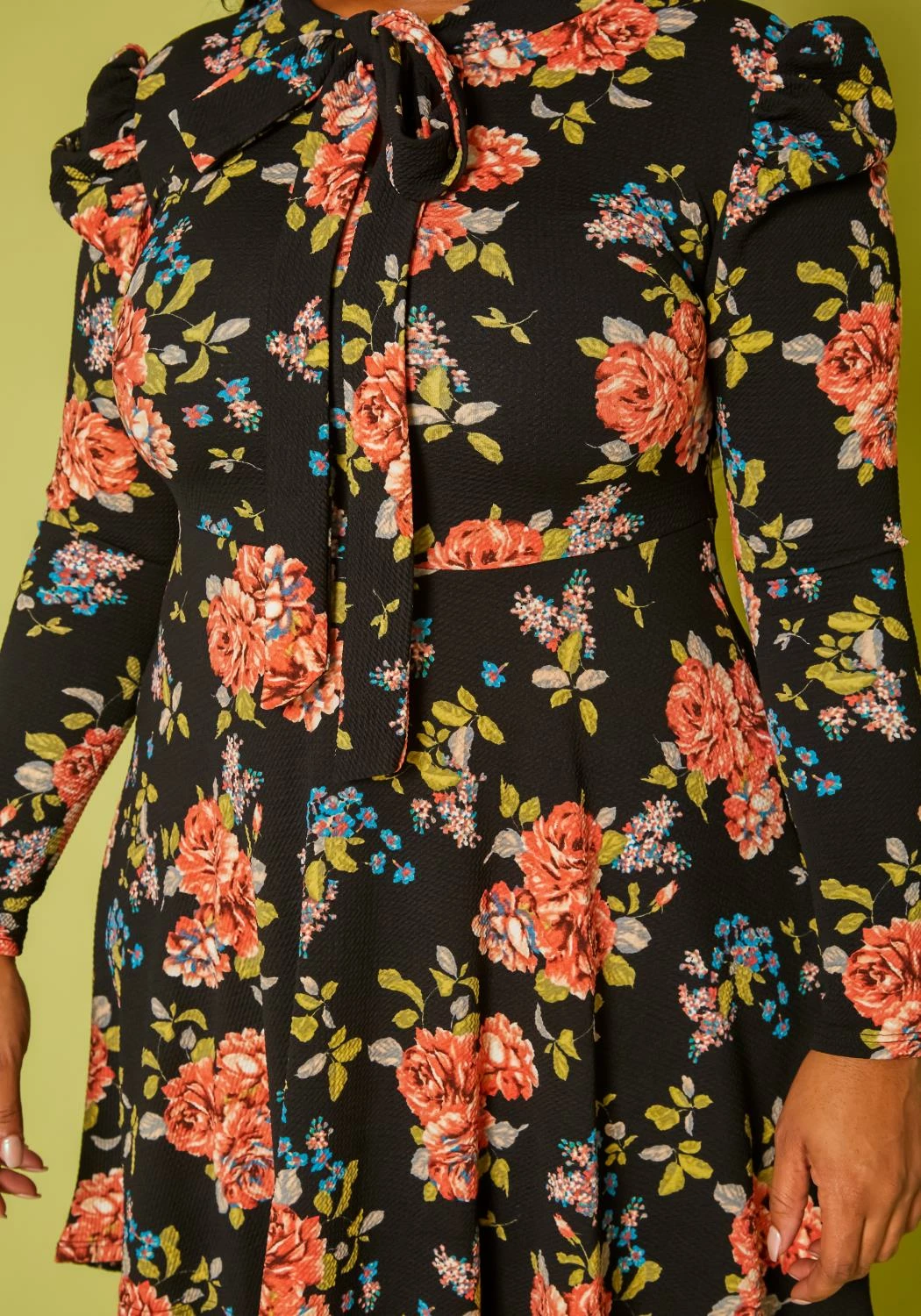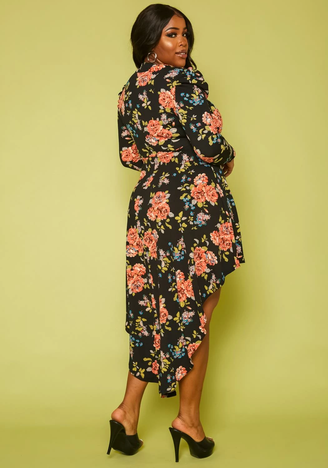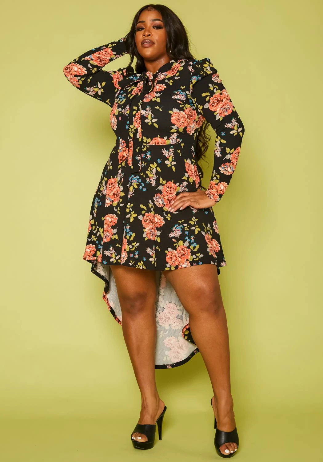Gorgeous plus size women’s fit to flare dress in rose floral print, long sleeves, bow collar detail and high to low design.