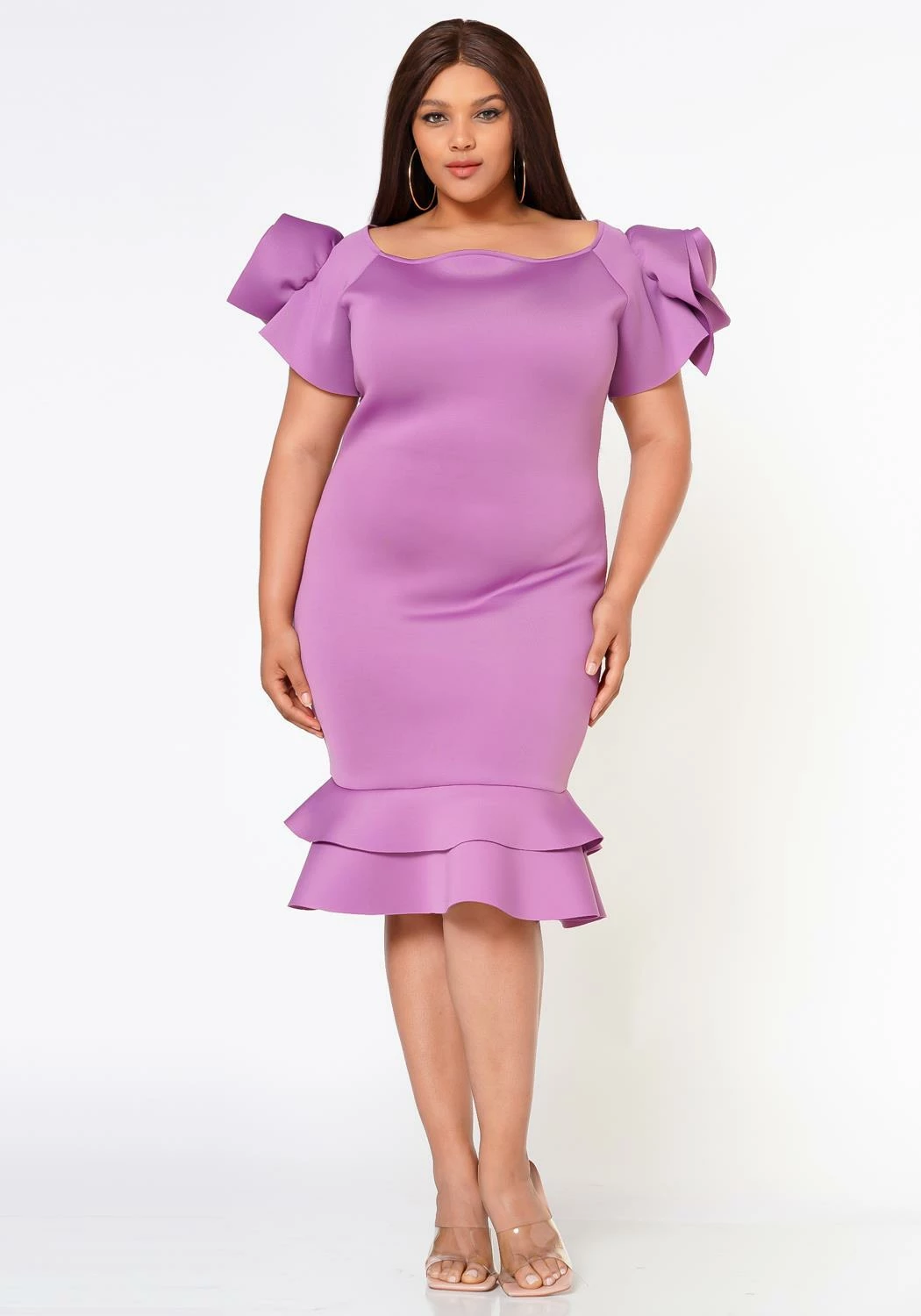Plus size women’s dress in midi style featuring a square neck hem, rose ruffled detailed sleeves, bottom ruffle detail and back zipper closure.