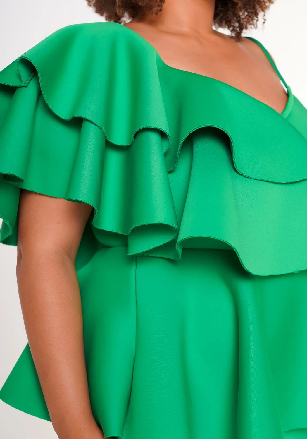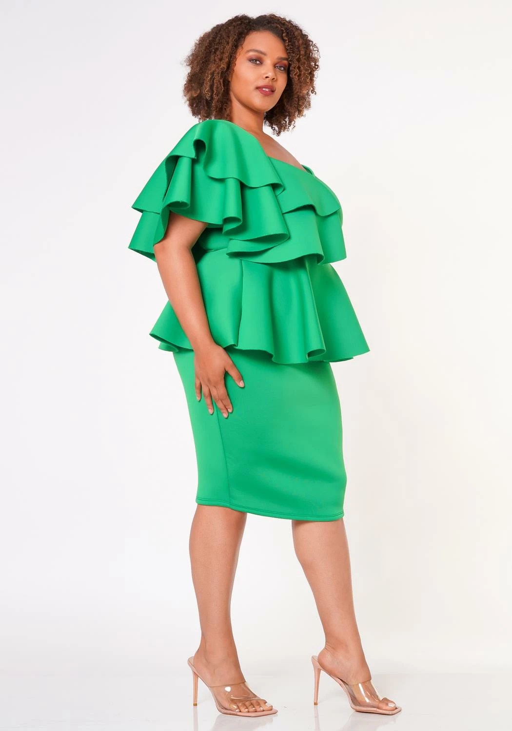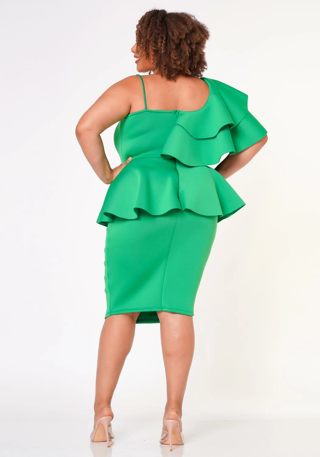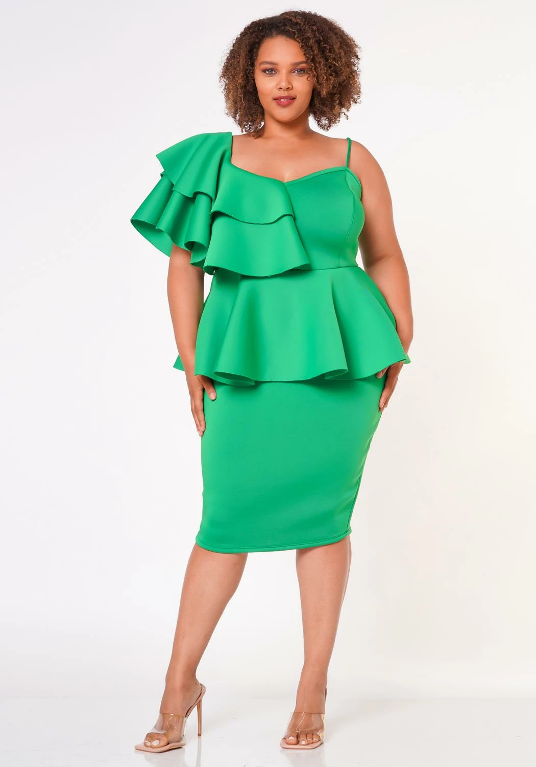 Plus size women’s dress in peplum style, featuring a ruffle one sleeve detail, v-neck hem & back zipper closure.