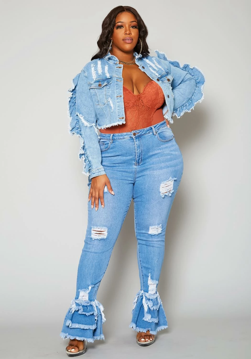 Plus size women’s denim jacket with distressed details, collar neck, ruffle trim long sleeve, button front hem and cropped fit.