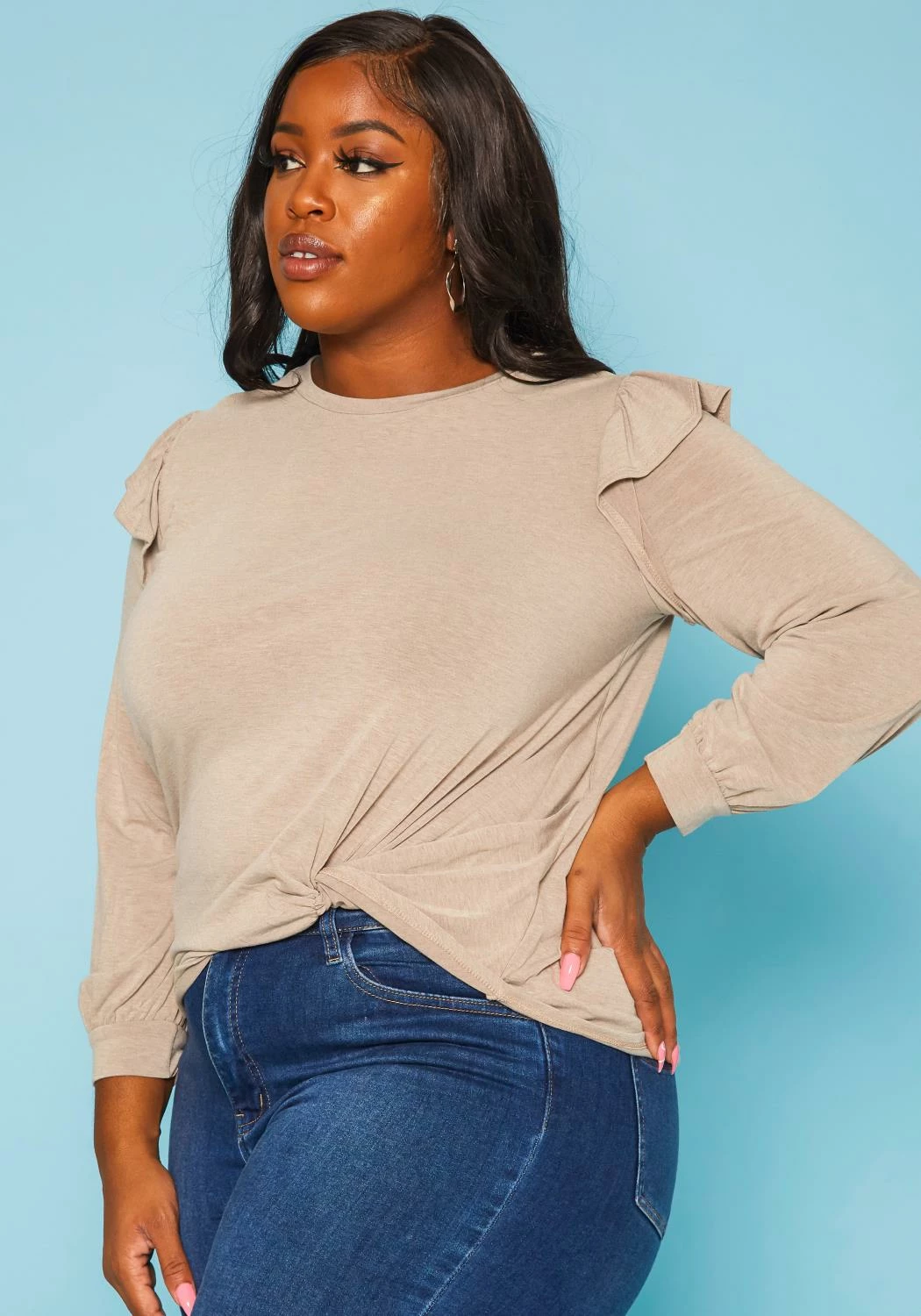 Chic plus size women’s top in round neck style, long sleeves, ruffle trim and twist hem detail.