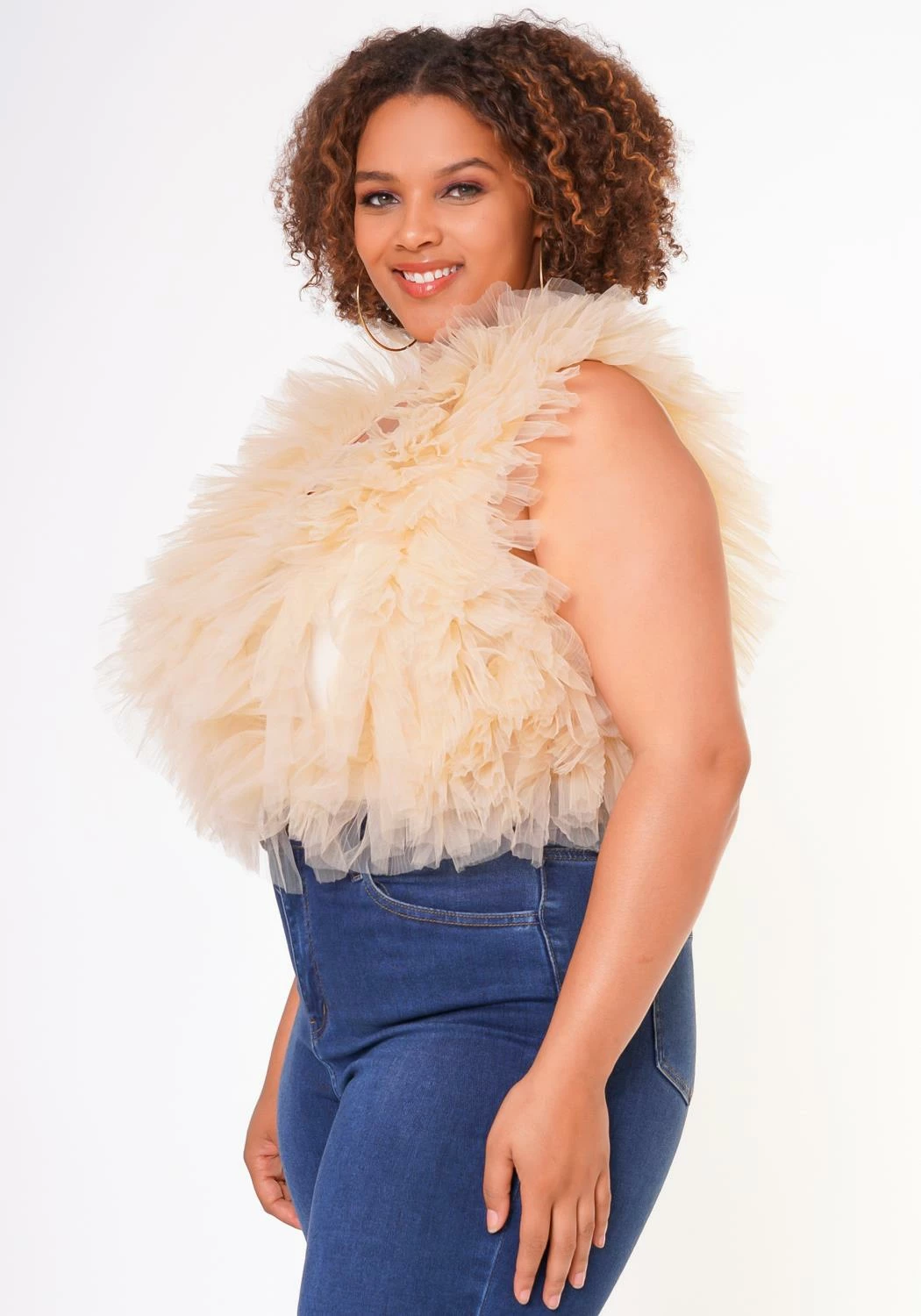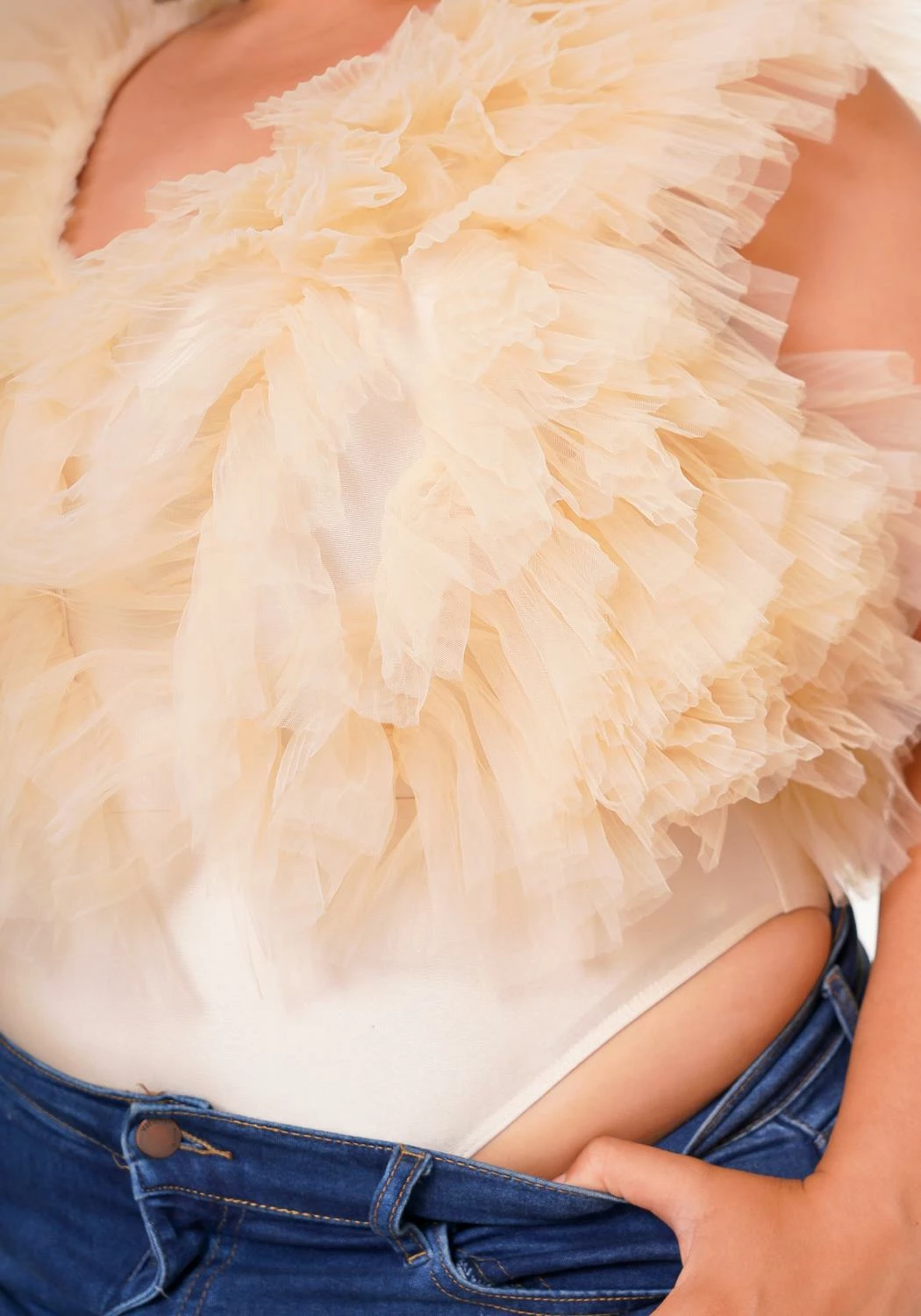 Plus size women’s v neck sleeveless tulle bodysuit for a special occasion with a back lace tie and ruffle detail.