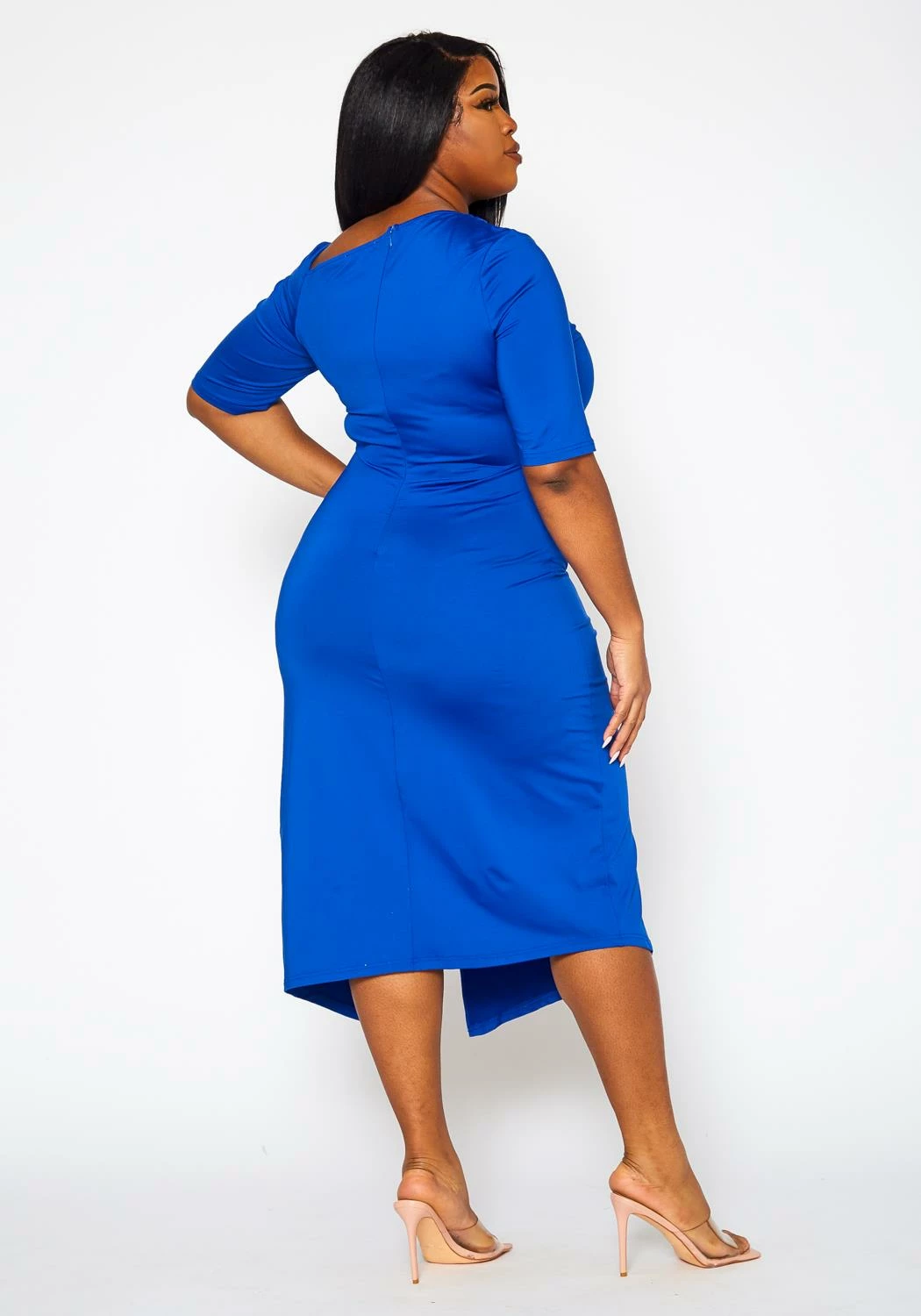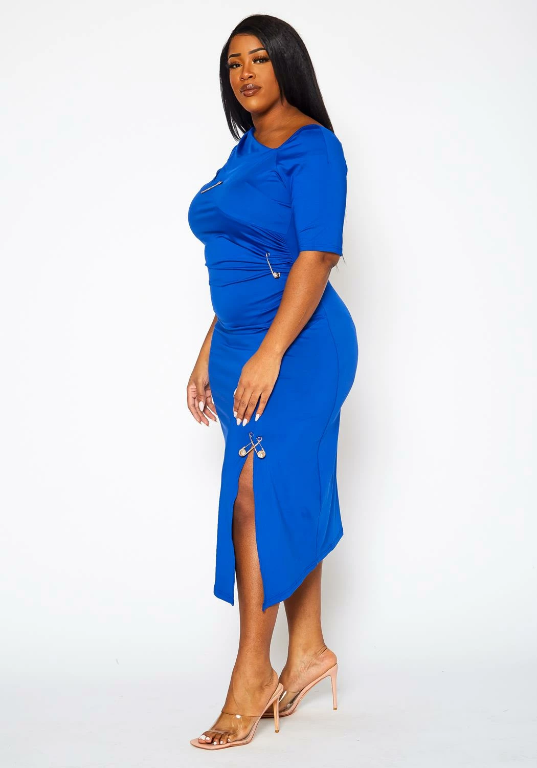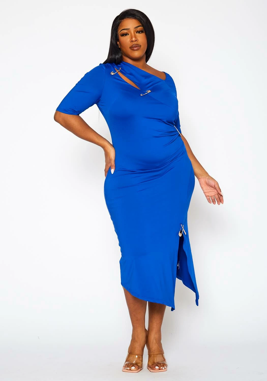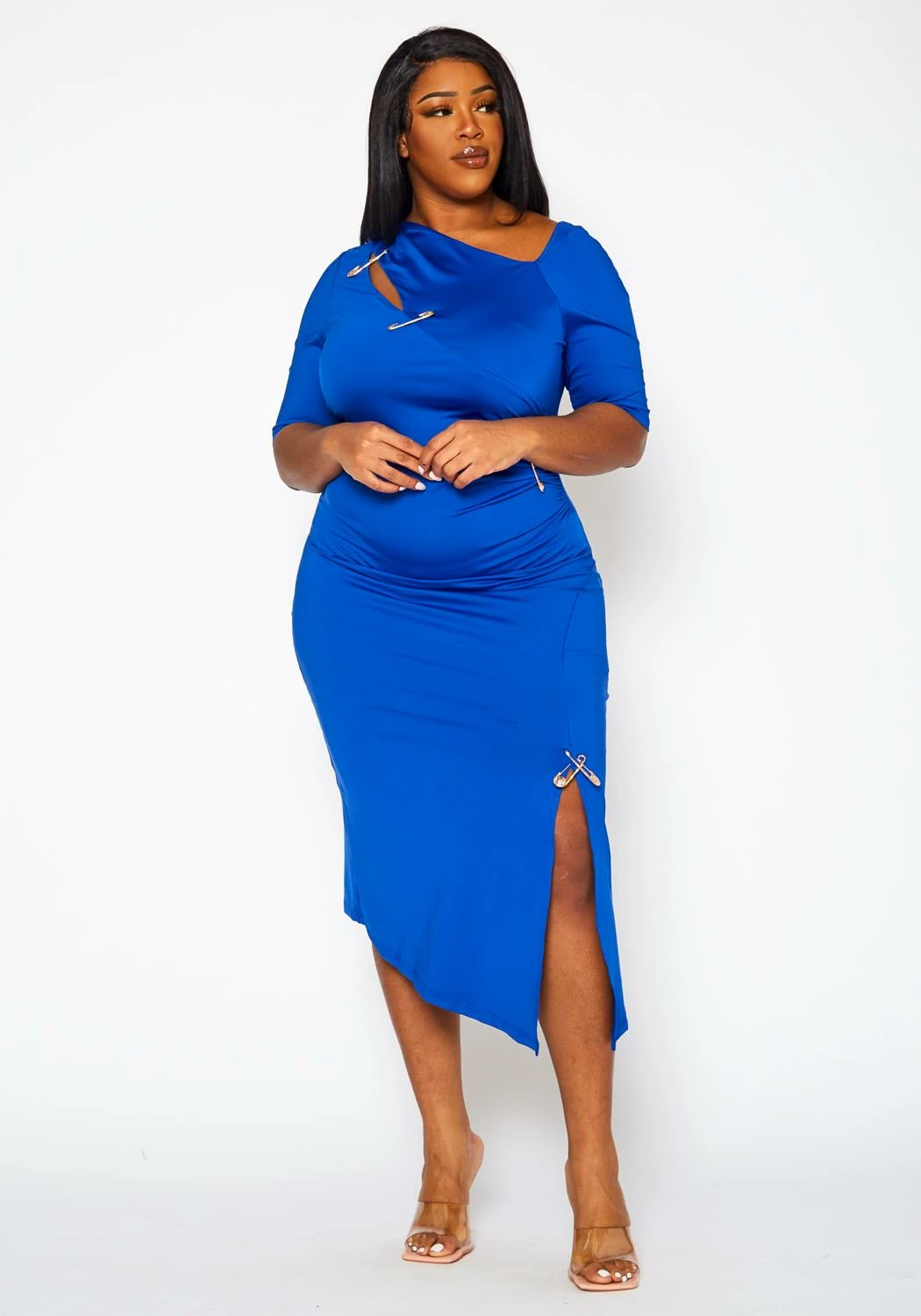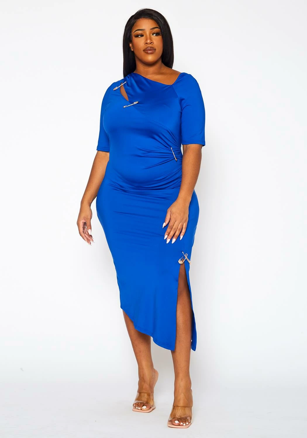 Plus size women’s bodycon dress that features safety pin adornments, asymmetric neckline, fitted short sleeves, front slit hem, midi length and back zipper closure.