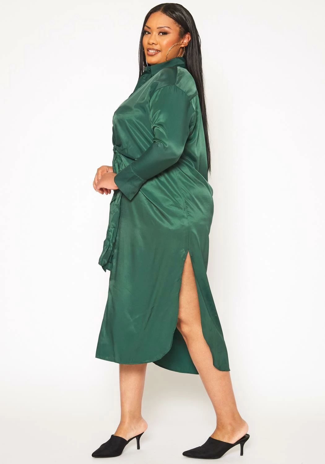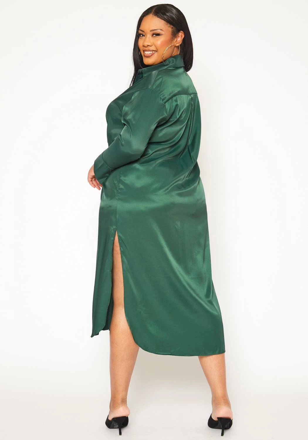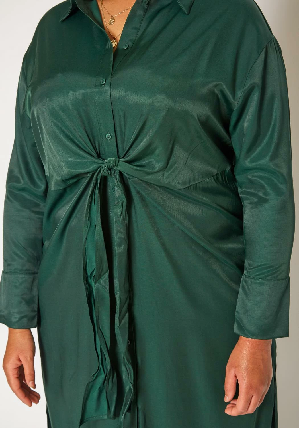 Plus size women’s effortless midi dress in satin material, collar neck, button front closure, tie front ascent, long sleeves and buttoned wrist cuffs.