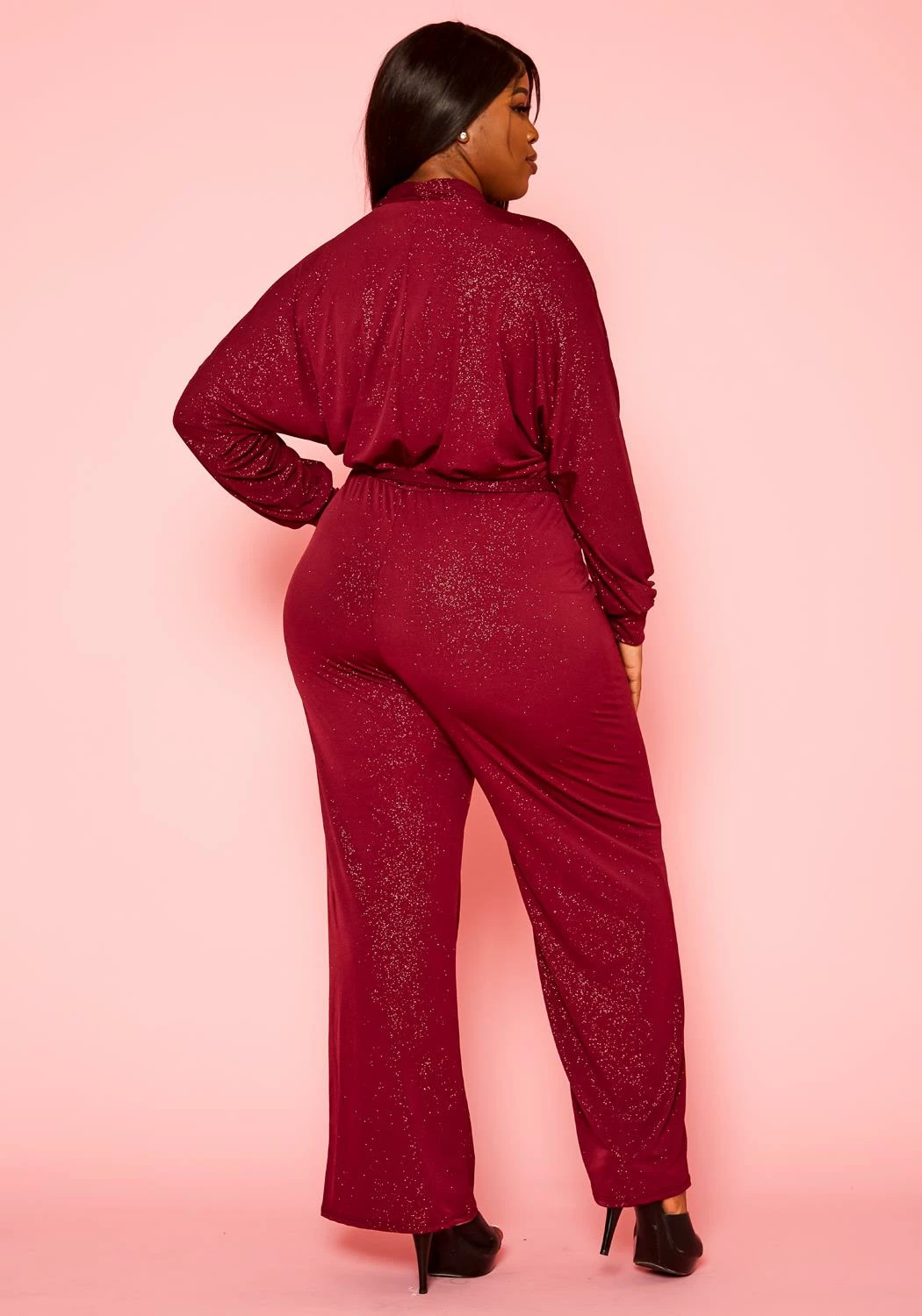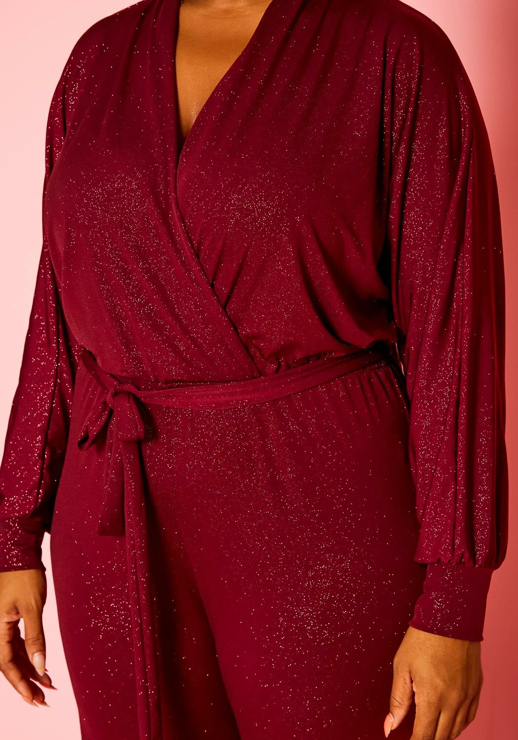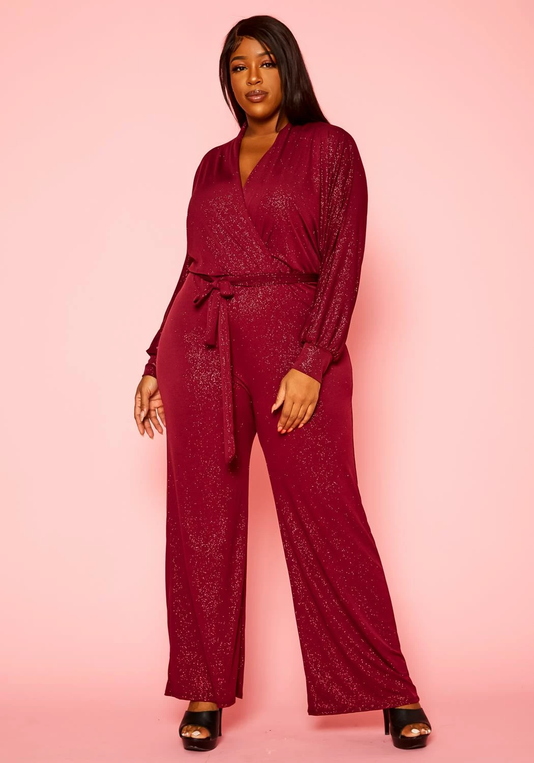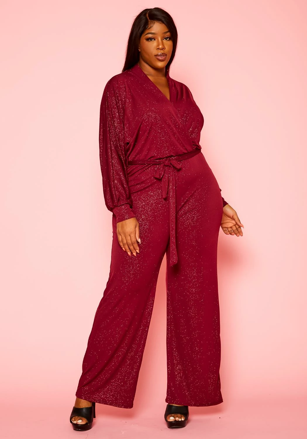 Timeless plus size women’s jumpsuit in lovely shimmer material, v-neck style, long sleeves, flare leg hem and waist tie ascent.