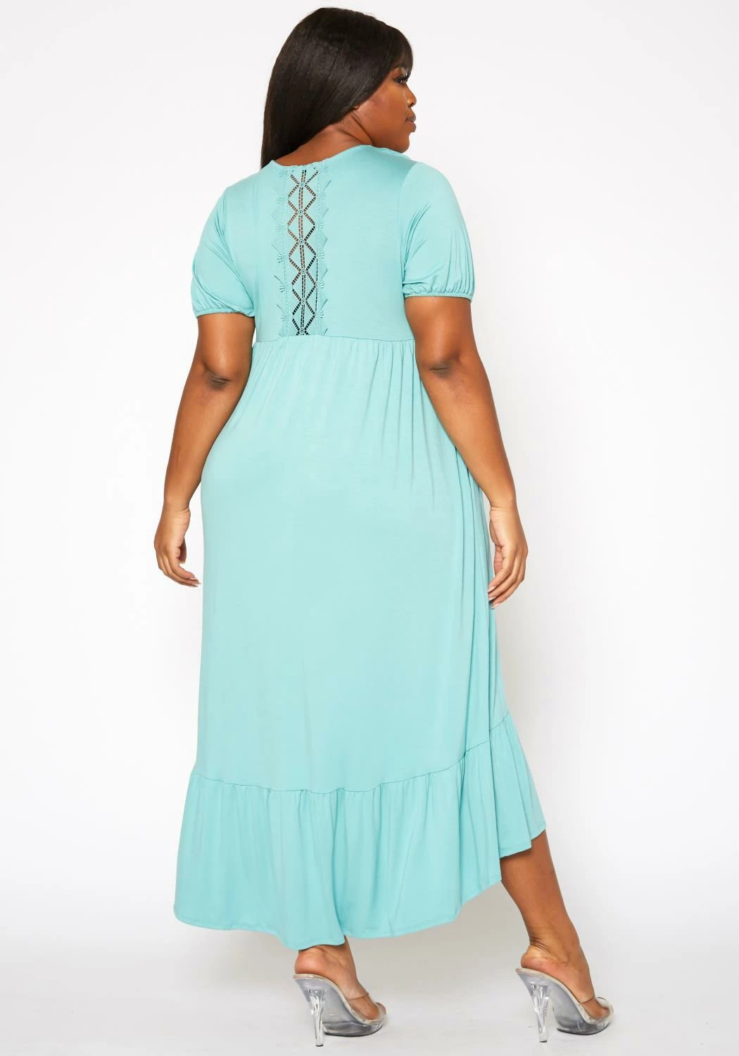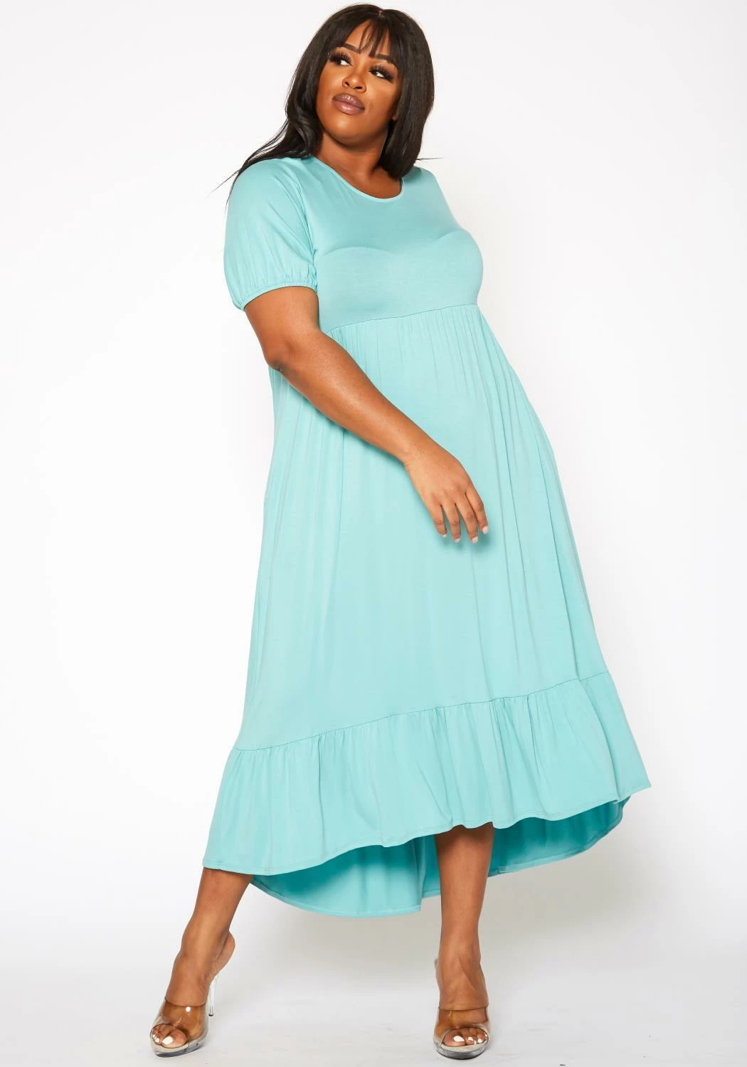 Effortless plus size women’s maxi dress in round neck style, short puff sleeves, ruffle flare hem and fit to flare design.