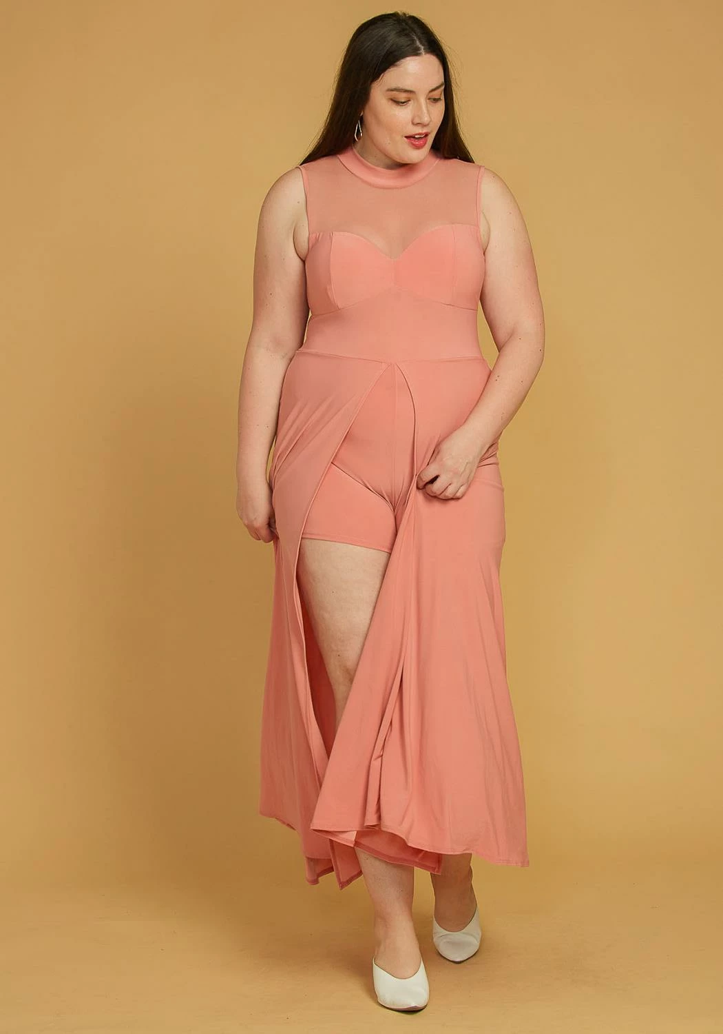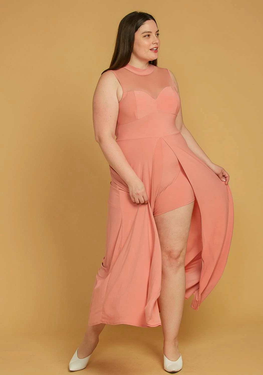 This plus size romper is unique in every way, with its long cape style skirt and illusion neckline.