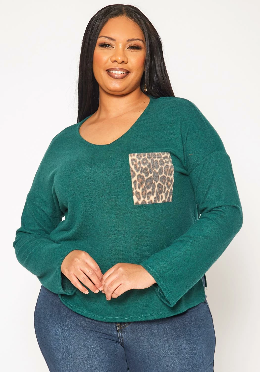 Casual plus size women’s long sleeve shirt in snakeskin print pocket detail, v-neck style, long sleeves and side slit hem.
