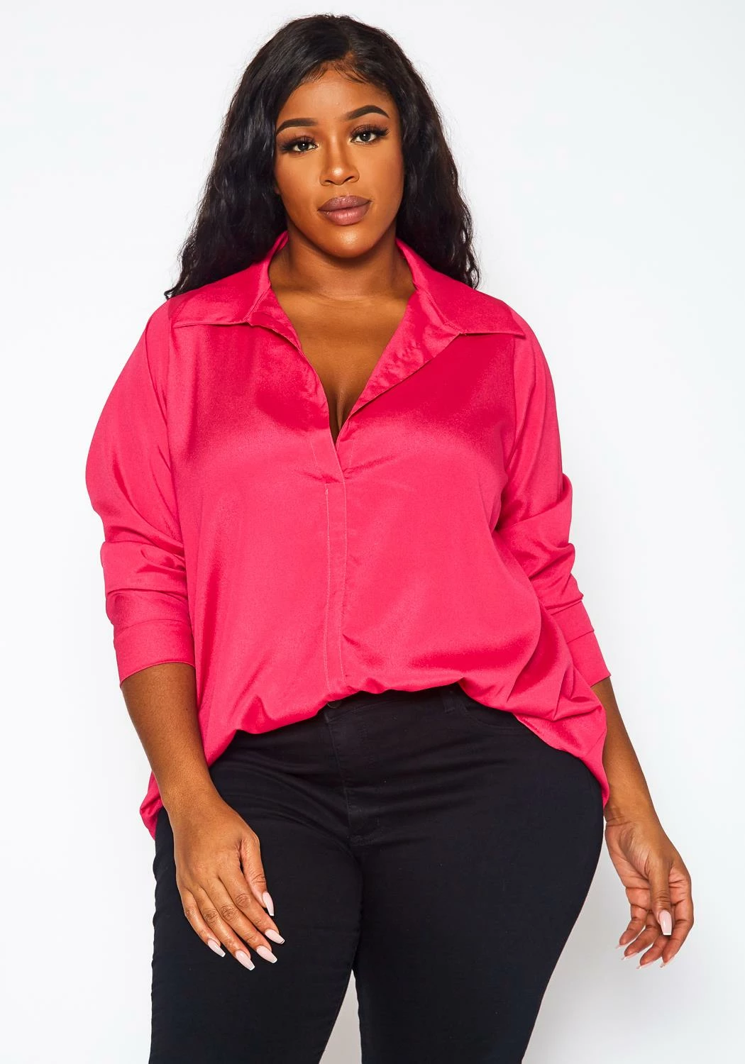 Plus size women’s collar neck shirt in solid color and lightweight material.