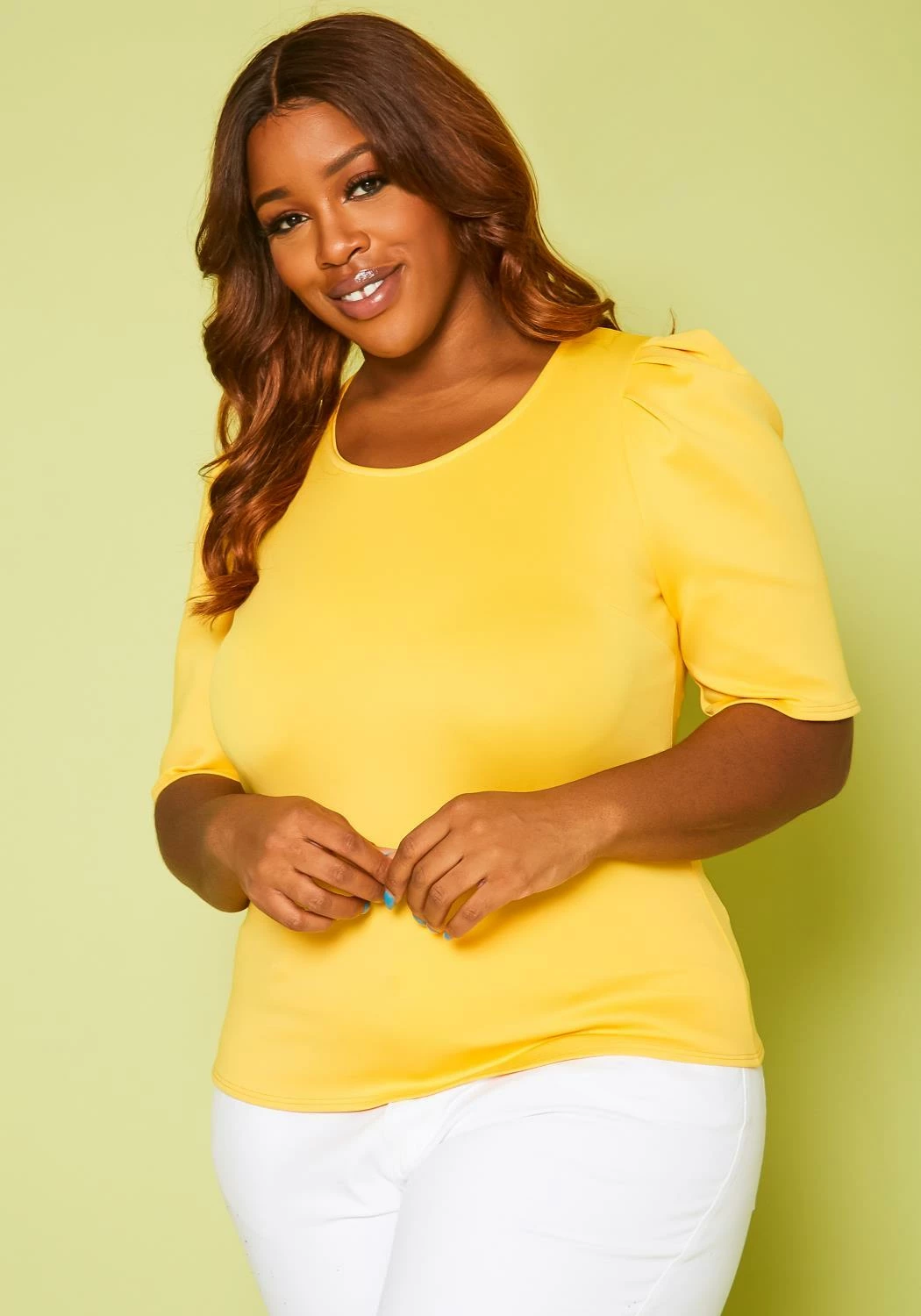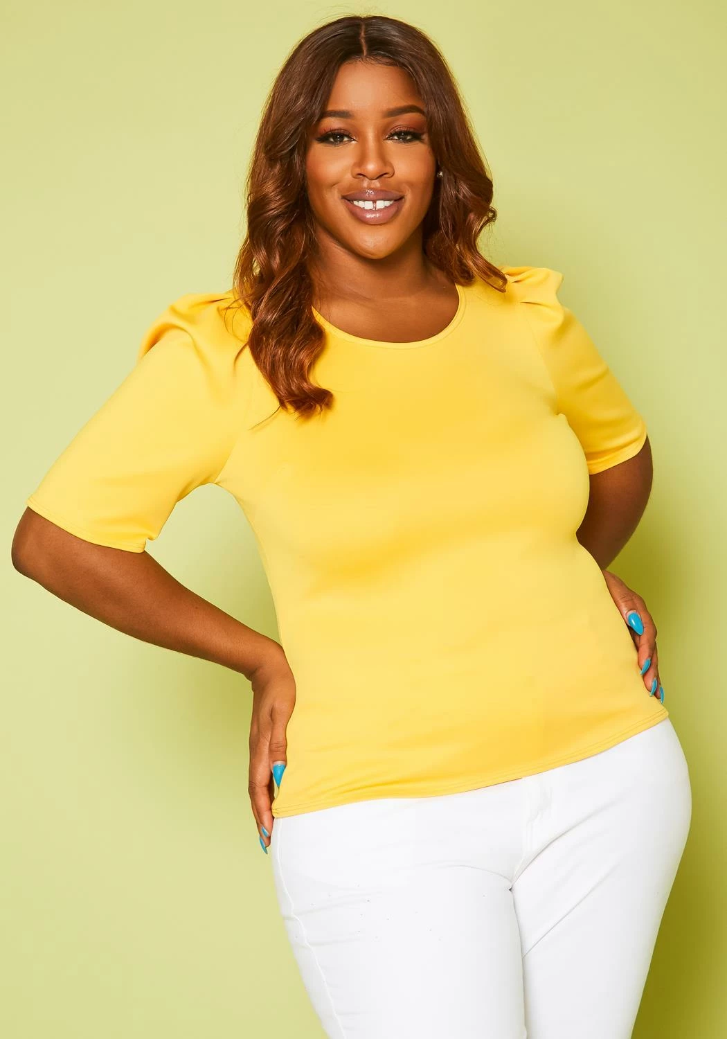 Mix & match our super chic women’s blouse in lovable kelly green color and puff shoulder details. Features body hugging material and half short sleeves.