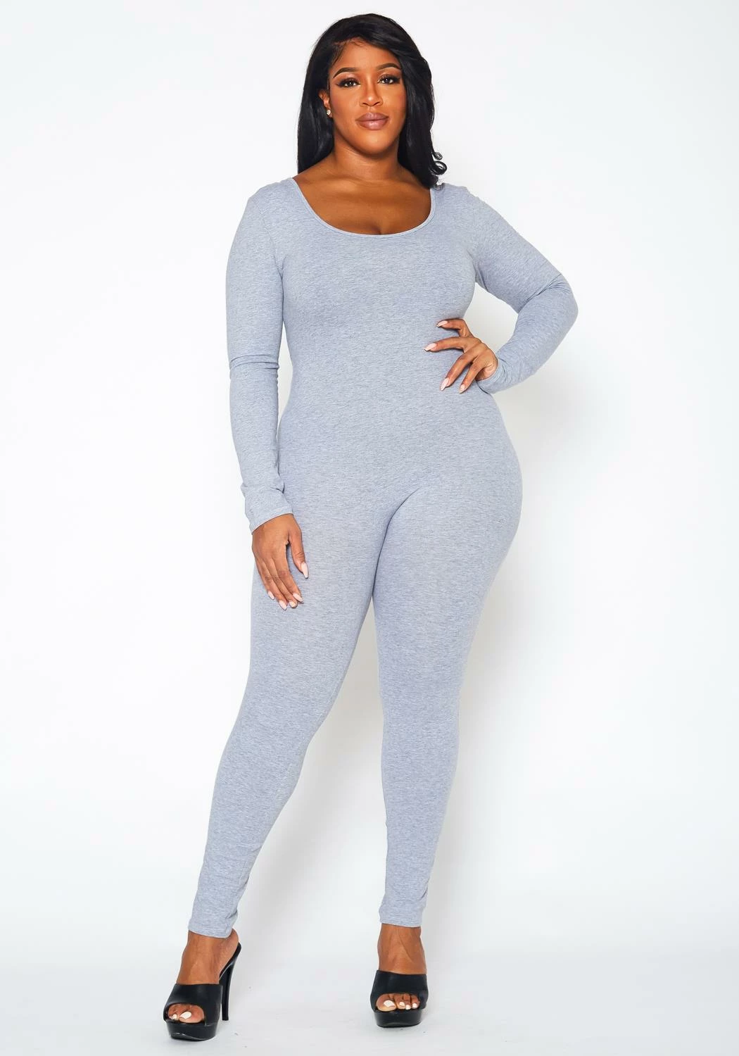 Must have solid color bodycon jumpsuit for plus size women in scoop neck style, low back design and fitted long sleeves.