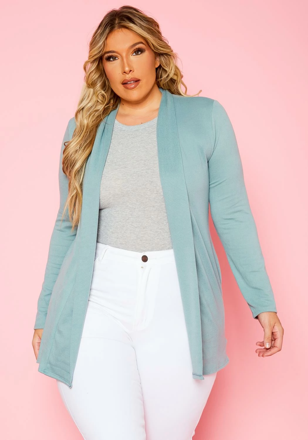 Plus size women’s basic solid color cardigan in favorite soft material, open front style, fitted long sleeves , pockets and notch collar.