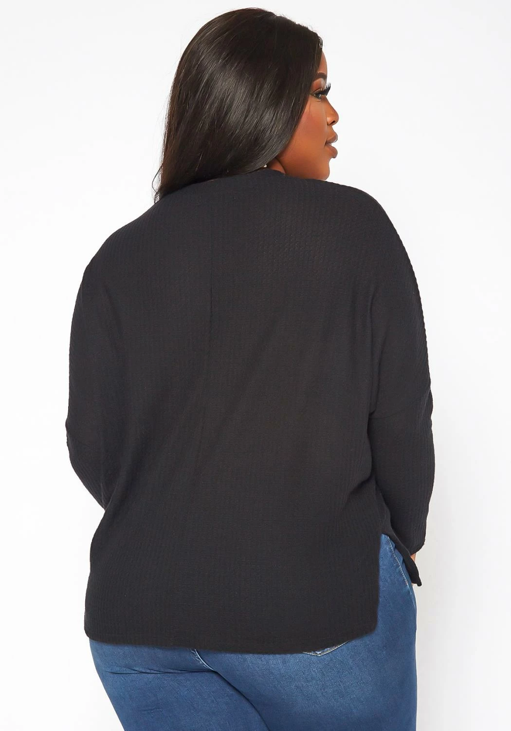 Plus size women’s waffle knit sweater in solid color, crew neck style, side slit hem and fitted long sleeves.