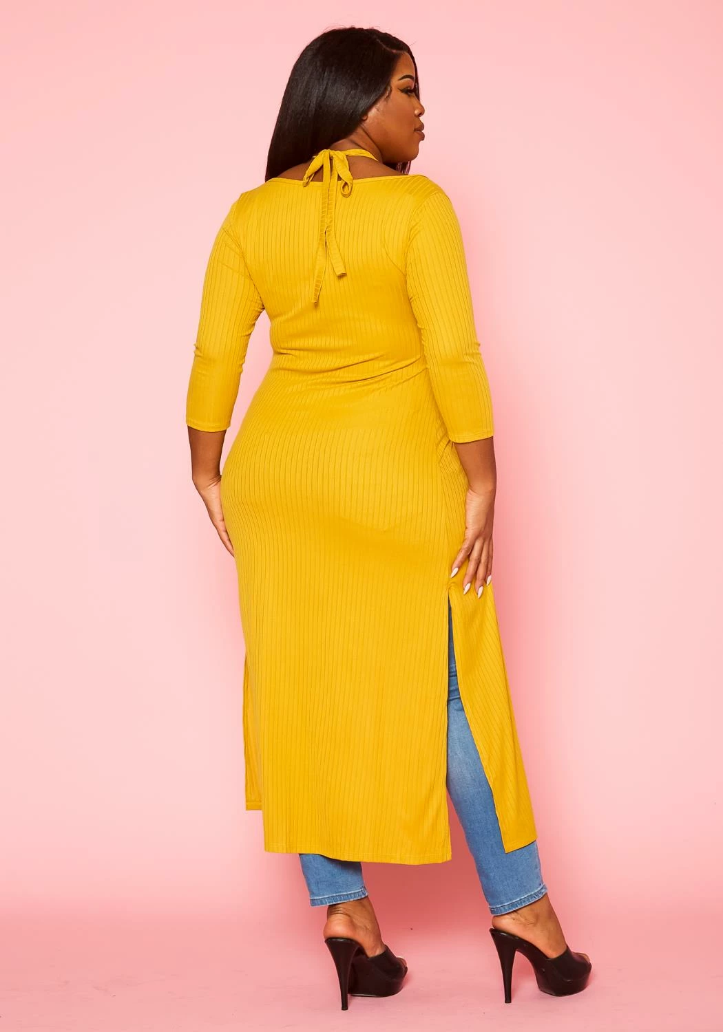 Plus size women’s longline top with halter neck tie, 3/4 fitted long sleeves and split hem design.