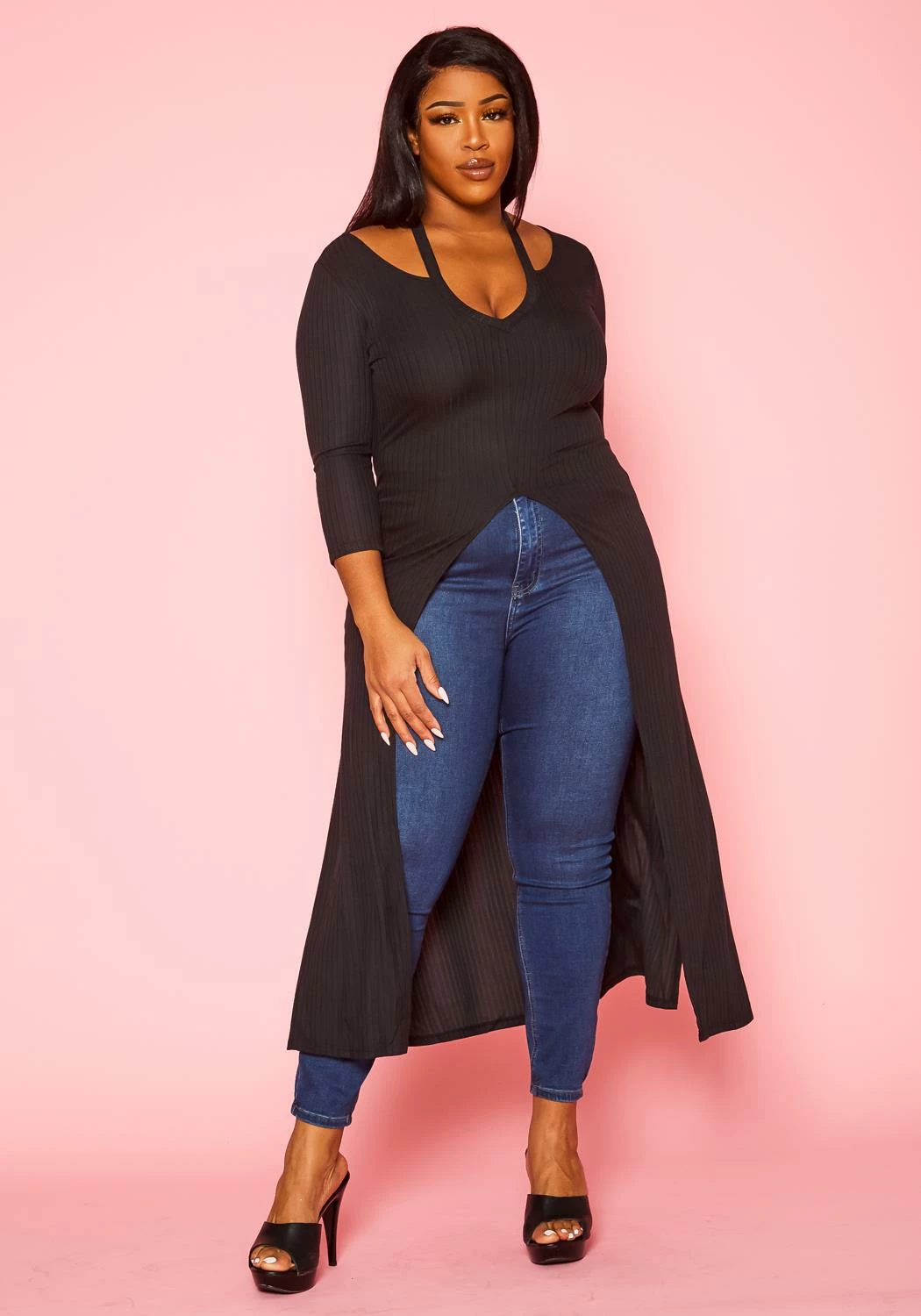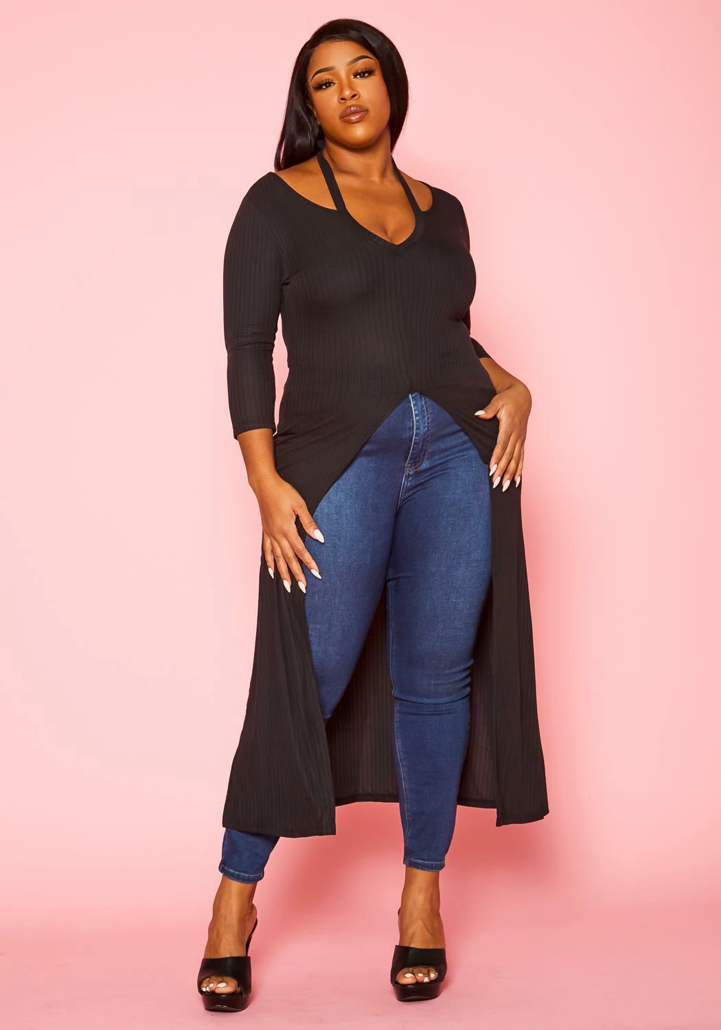 Plus size women’s longline top with halter neck tie, 3/4 fitted long sleeves and split hem design.