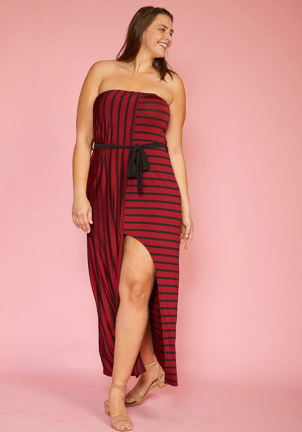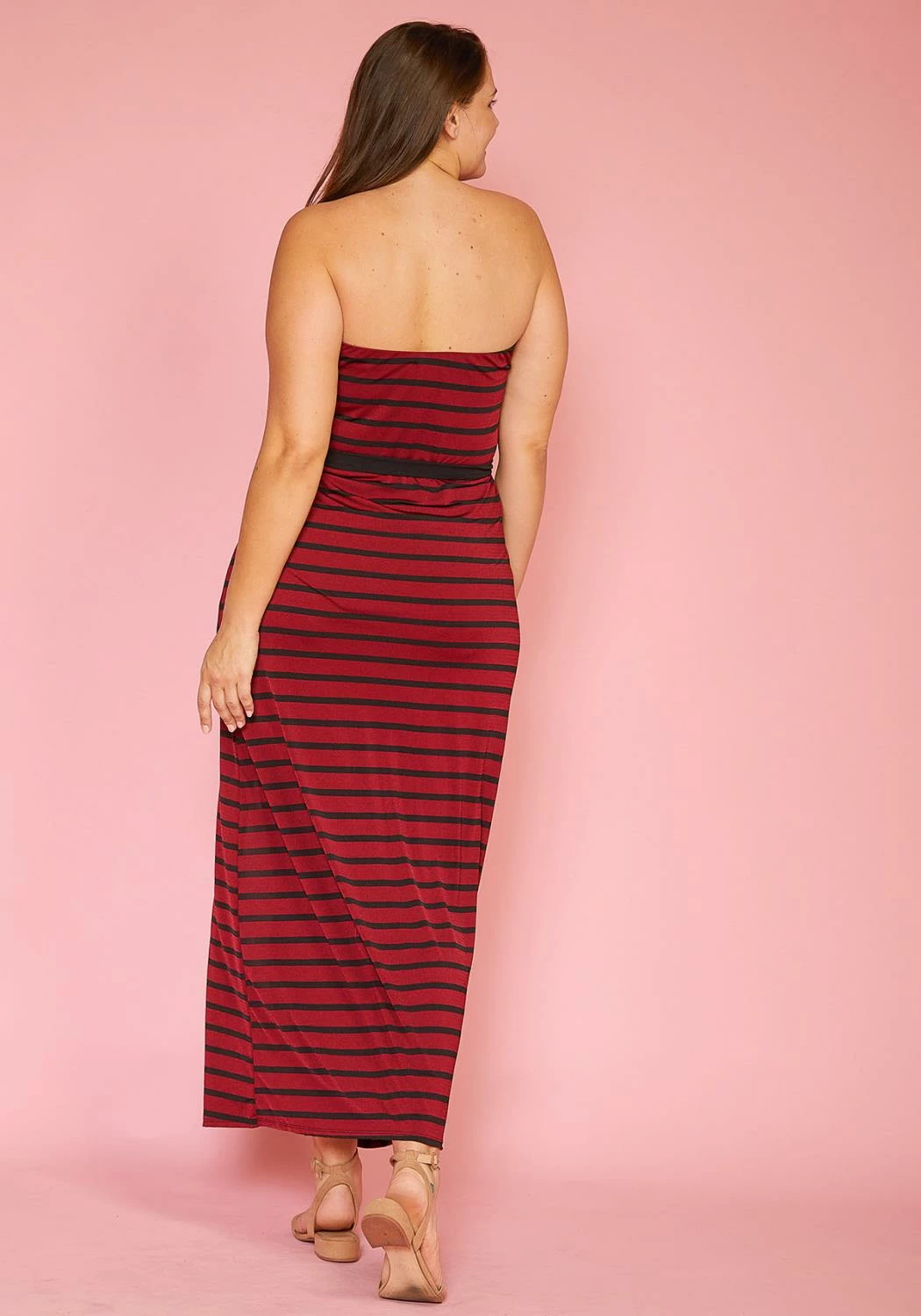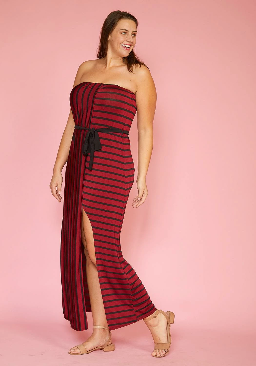 Strapless maxi dress with various allignments of stripes and an asymmetrical skirt.