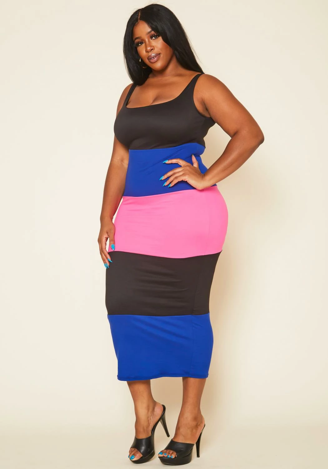 Plus size women’s dress in midi style, featuring a color block striped design, tank style with a bodycon fit.