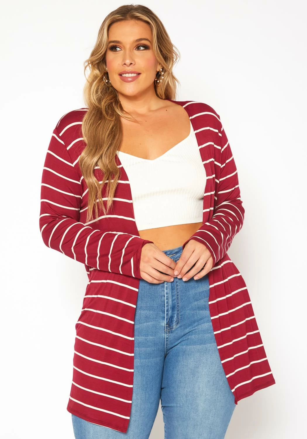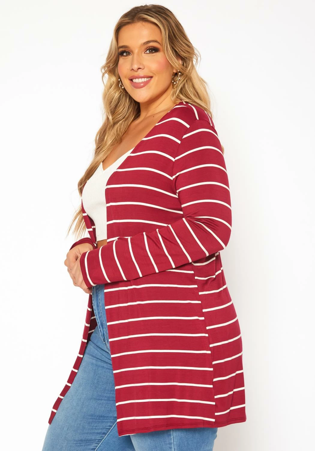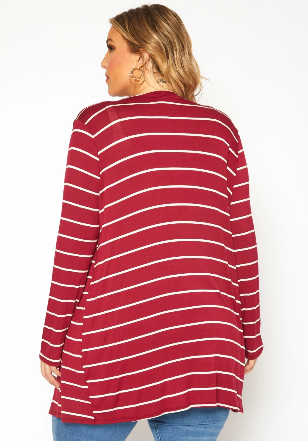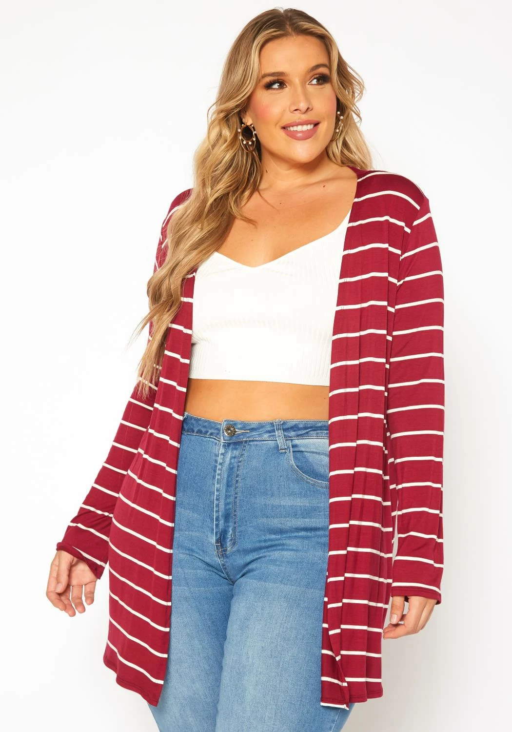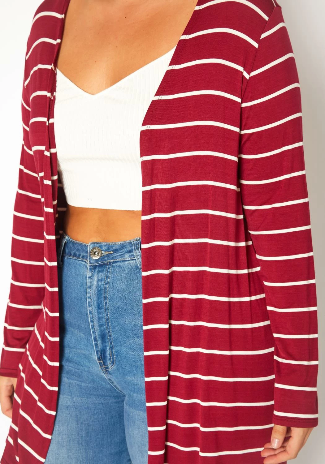 Casual plus size women’s cardigan in striped pattern, open front style, drape front hem and fitted long sleeves.
