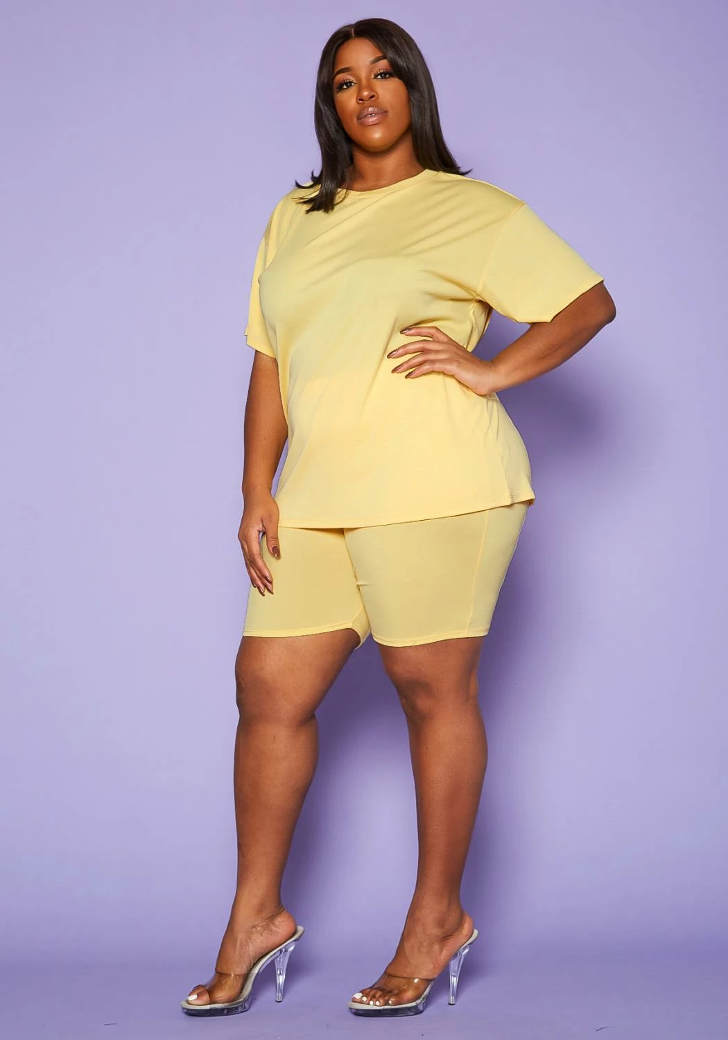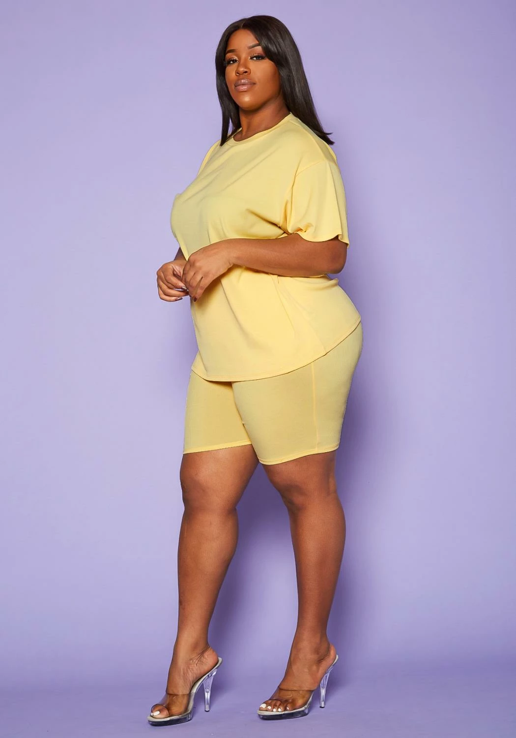 Lovely plus size women’s two piece set to wear when you wanna be comfortable, but can be ready for a sporty look by a simple tie knot hem.