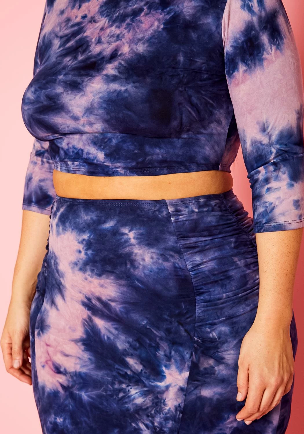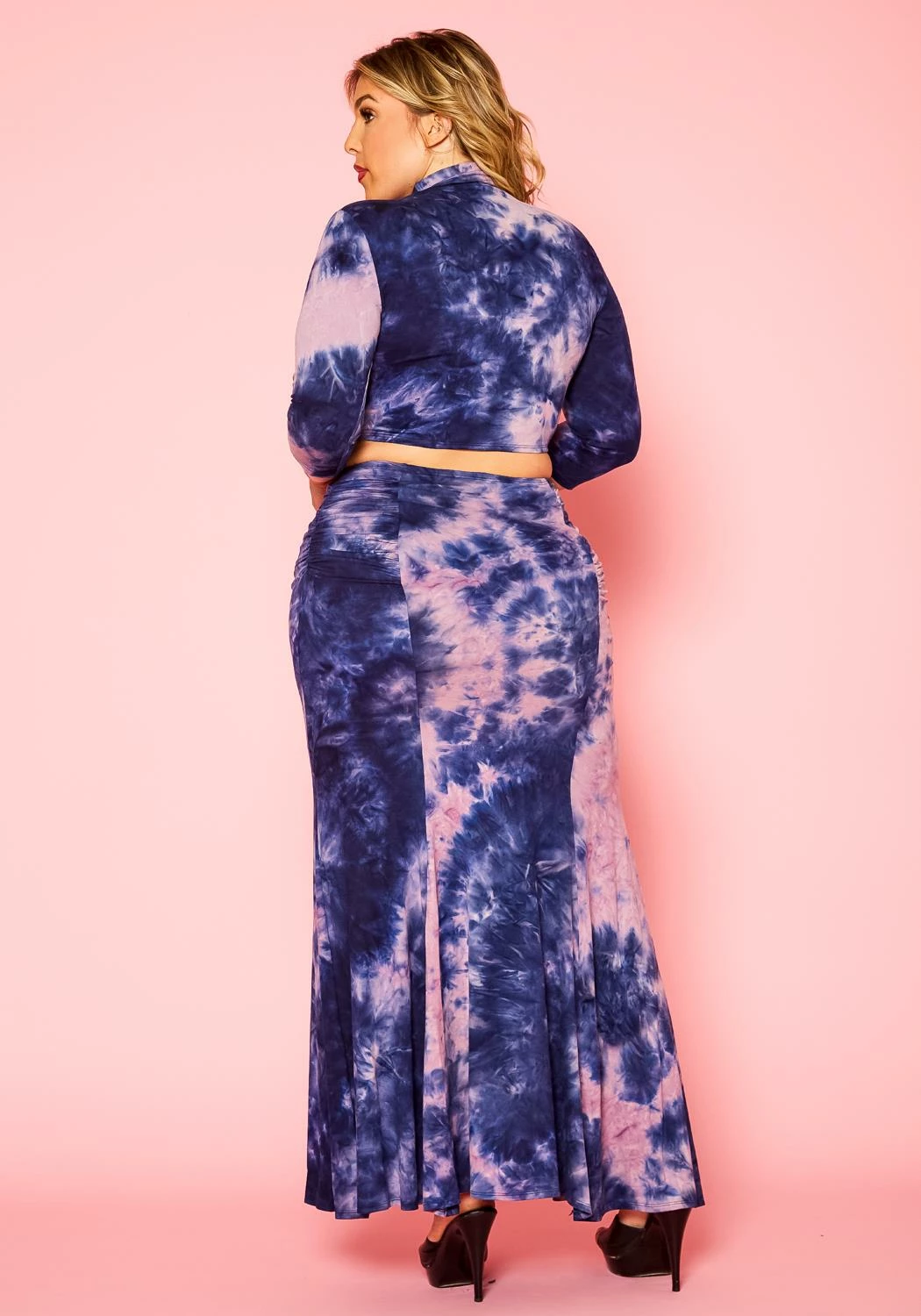 Attention grabbing plus size women’s matching set which features a mock neck, half sleeve, crop top and high waist mermaid flare maxi skirt.