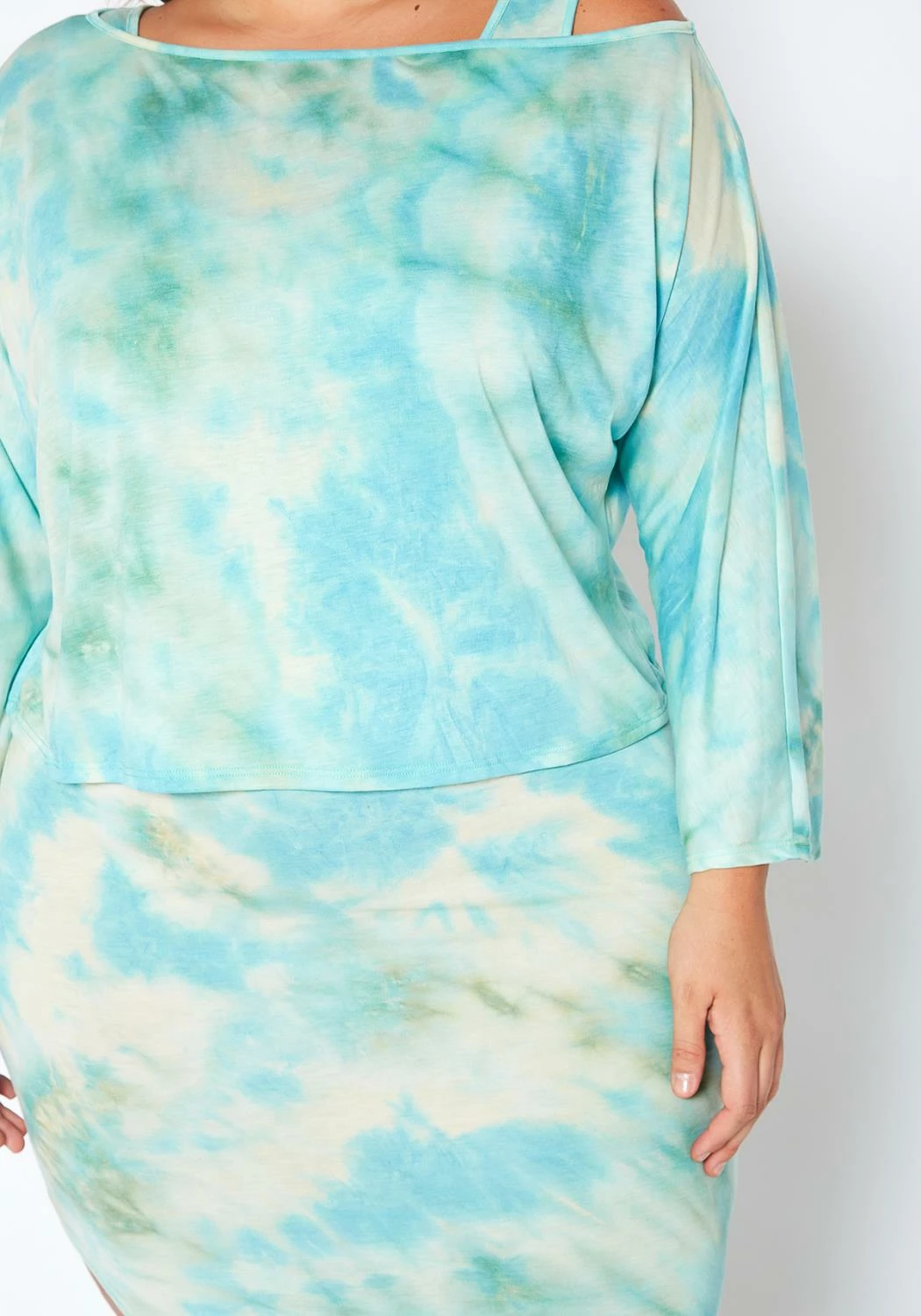 A comfortably stylish plus size women set which features an aqua tie dye sweatshirt that can be worn over a tank midi dress for a more casual vibe.