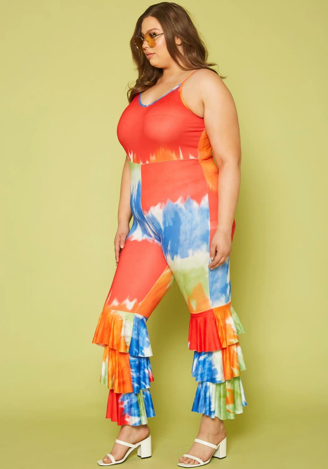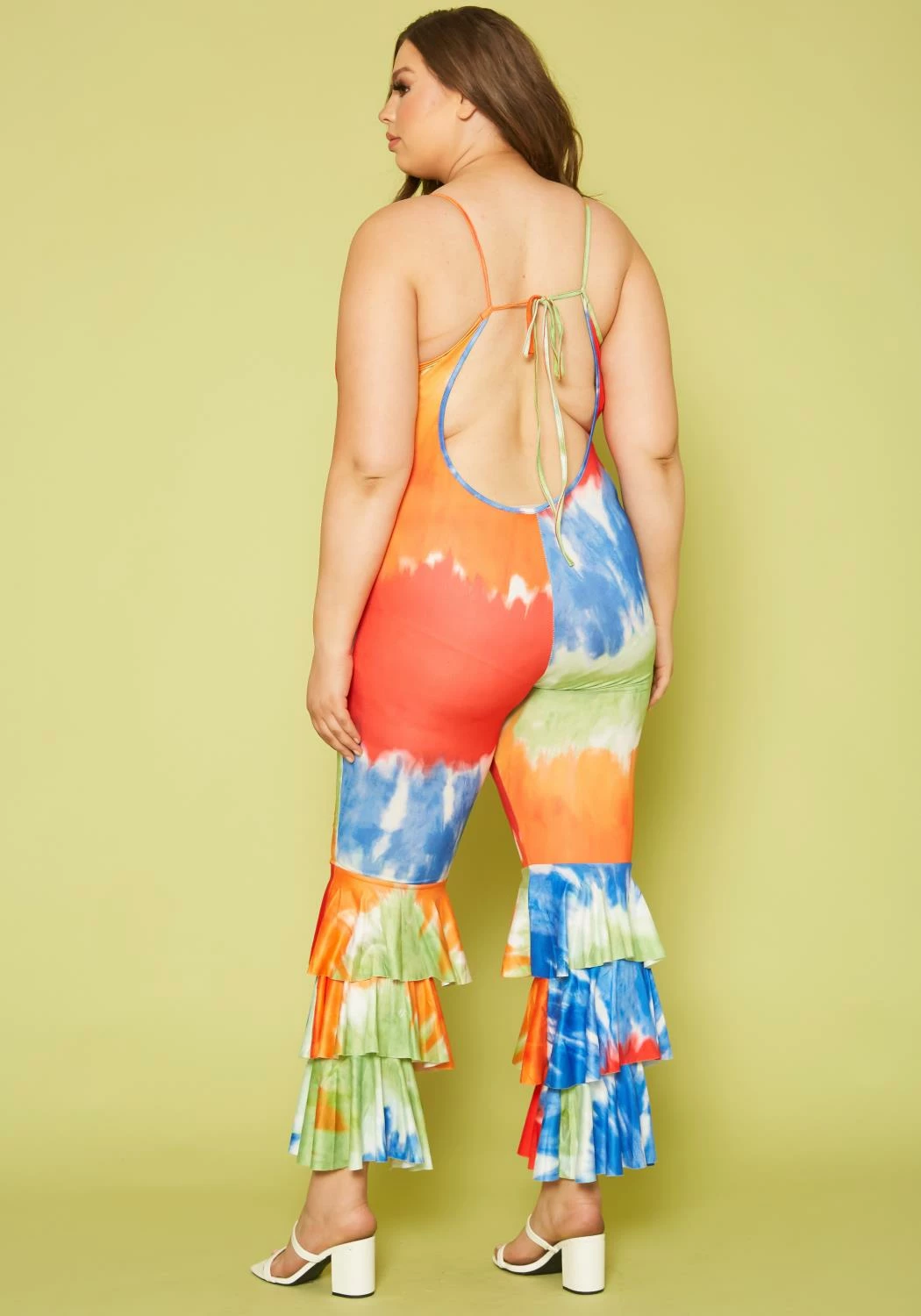 Tie dye print jumpsuit in v-neck style, cami shoulder straps and tiered flare design.