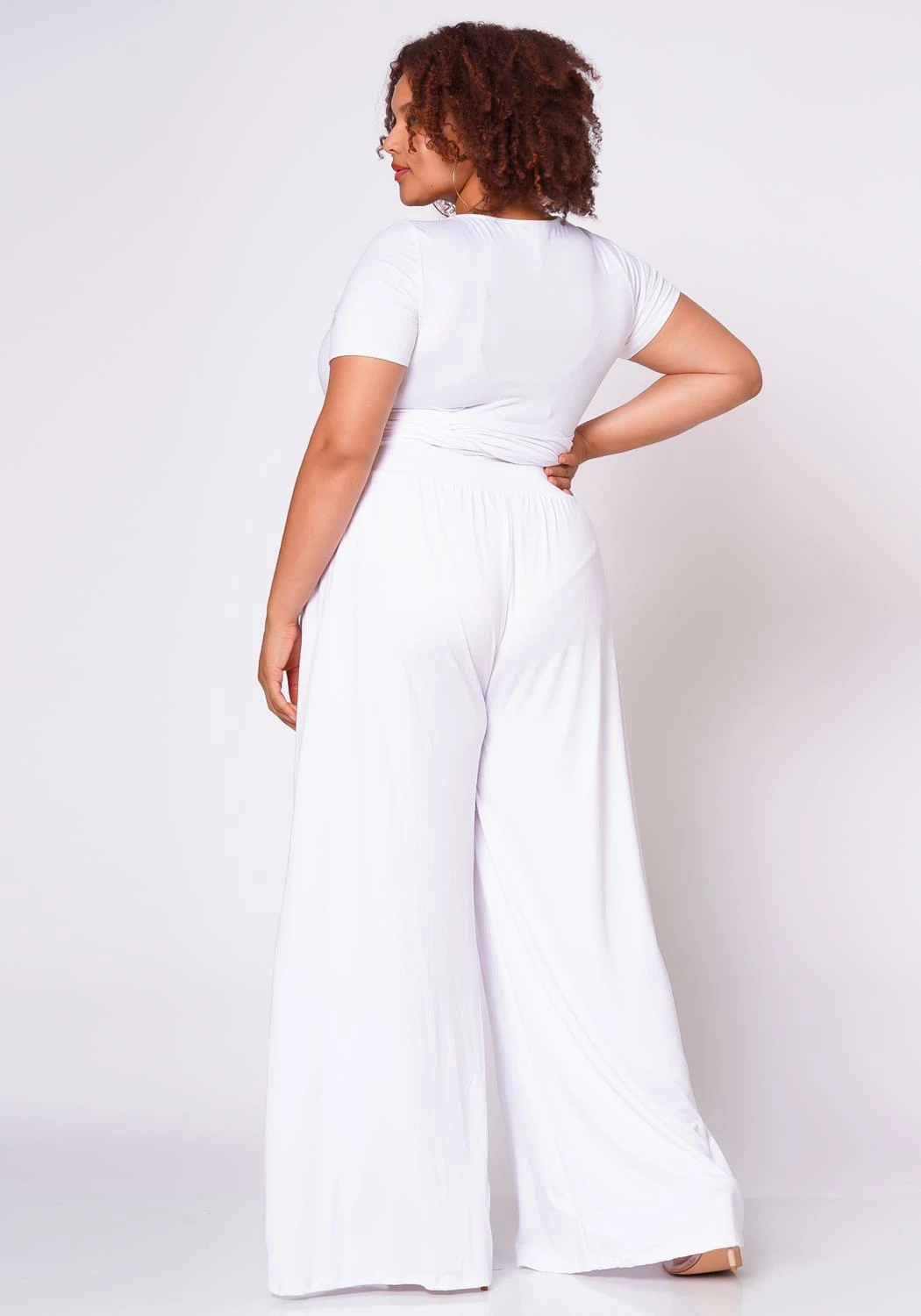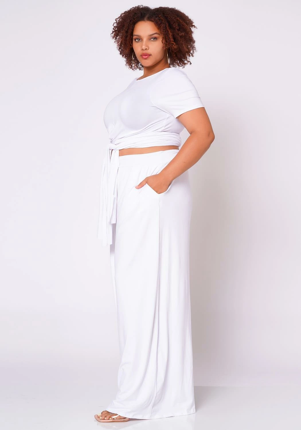 Effortless plus size women’s set which features a tie front short sleeve crop top and high waist wide flare pants with pocket hem.