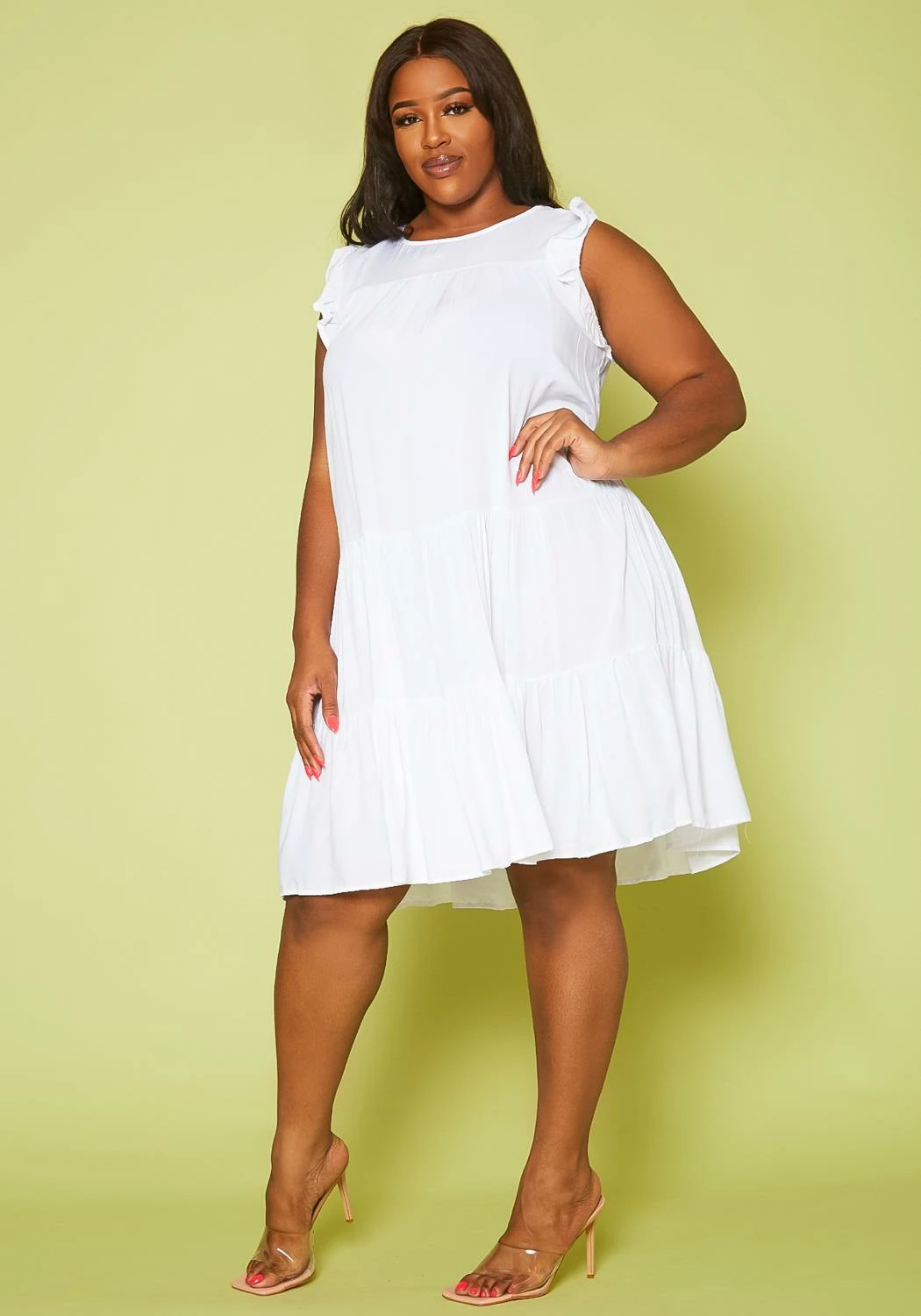 Plus size women’s dress in tiered style, featuring ruffle sleeveless hem, round neck hem, tiered & ruffle detail with back zipper closure.