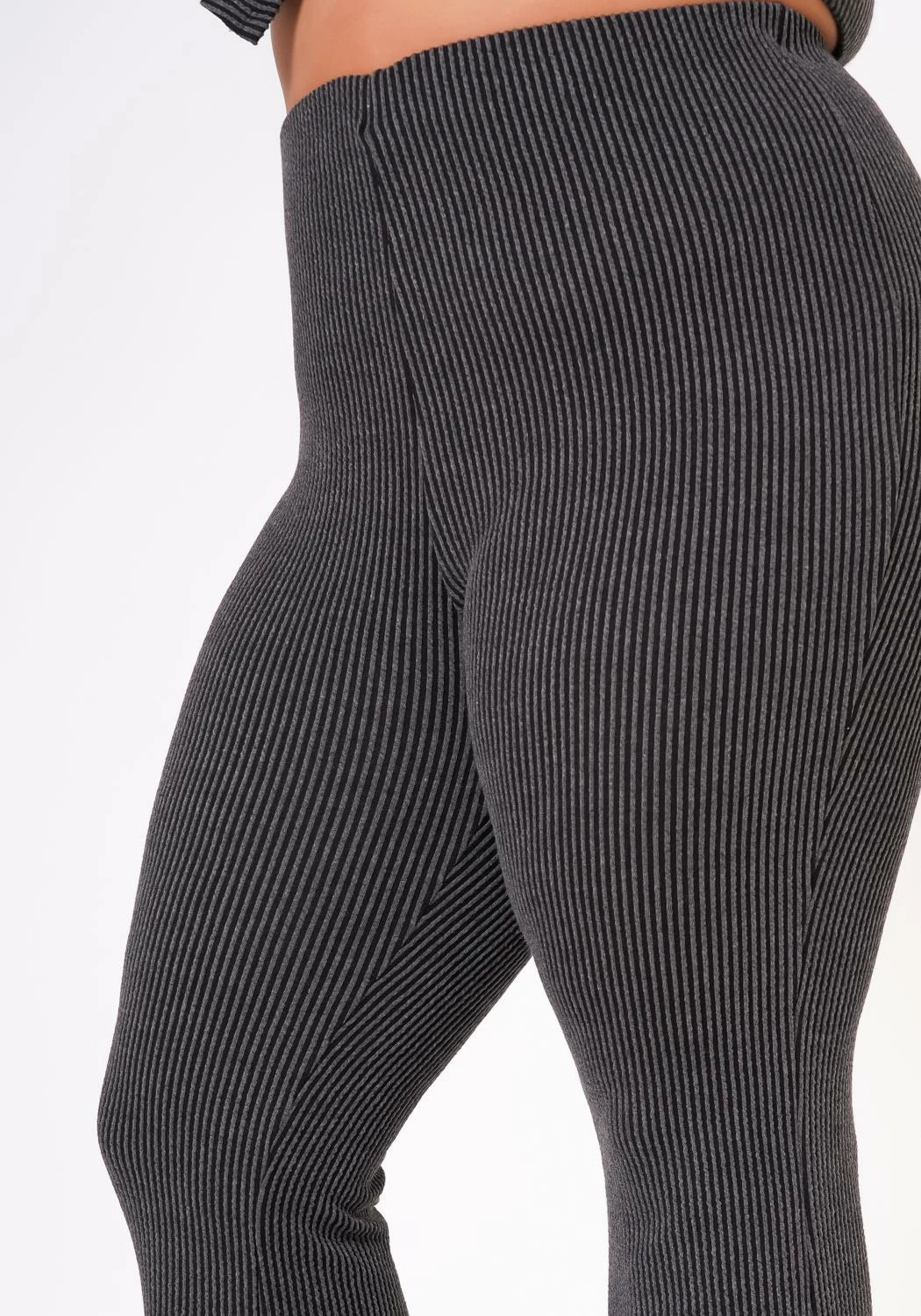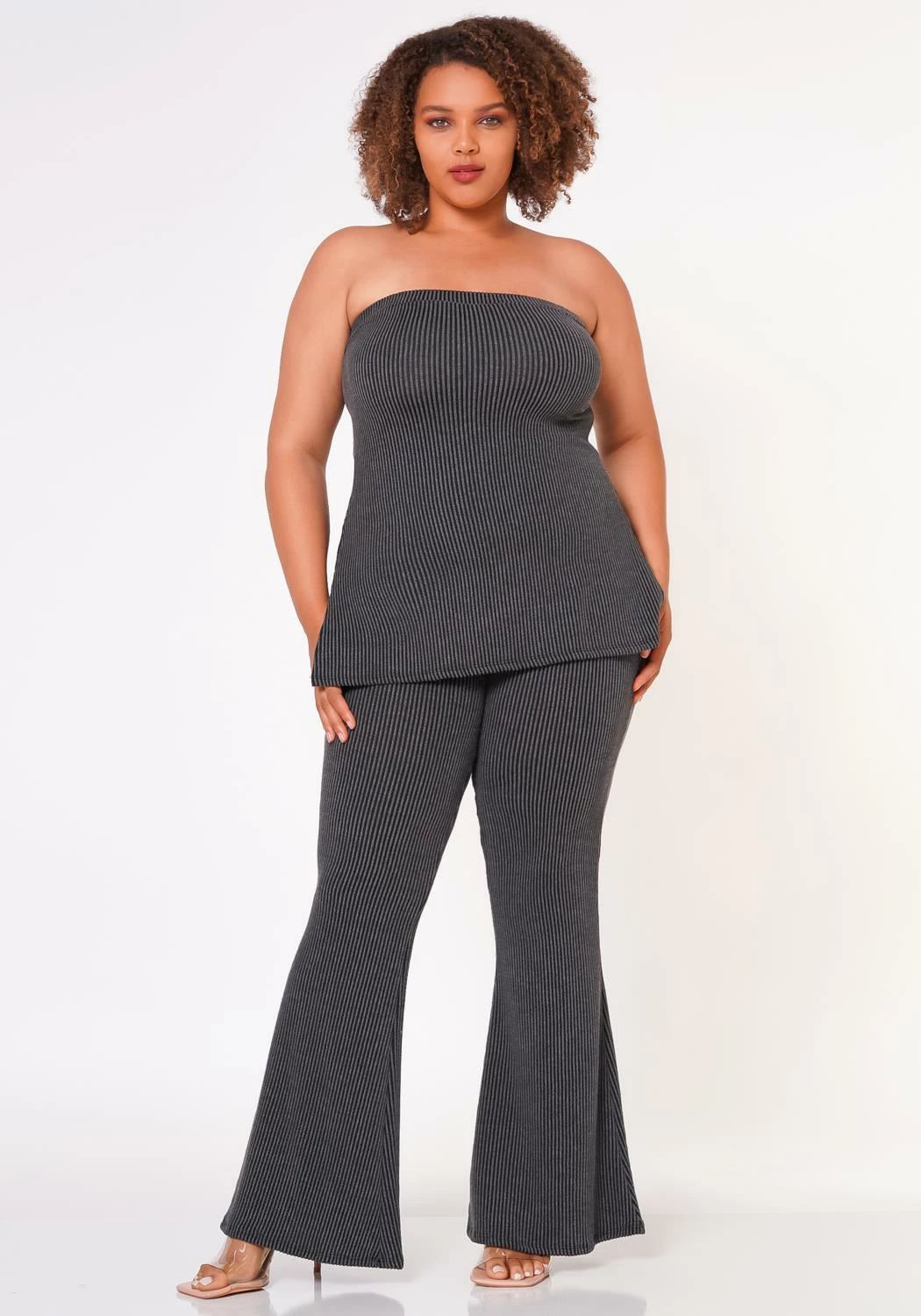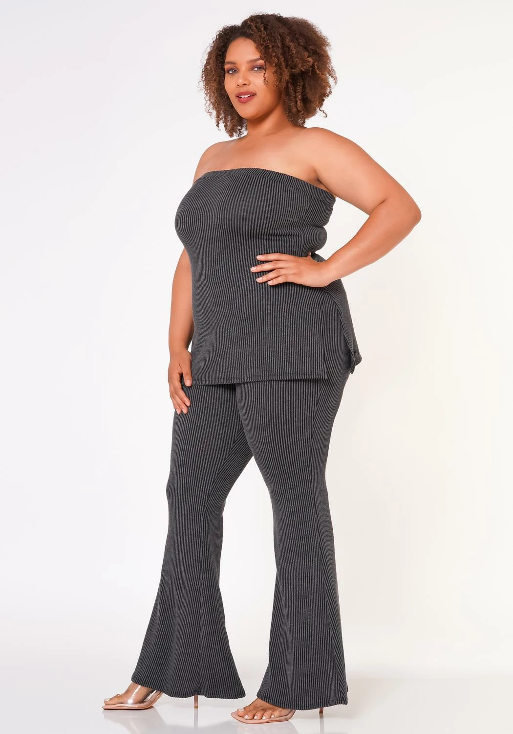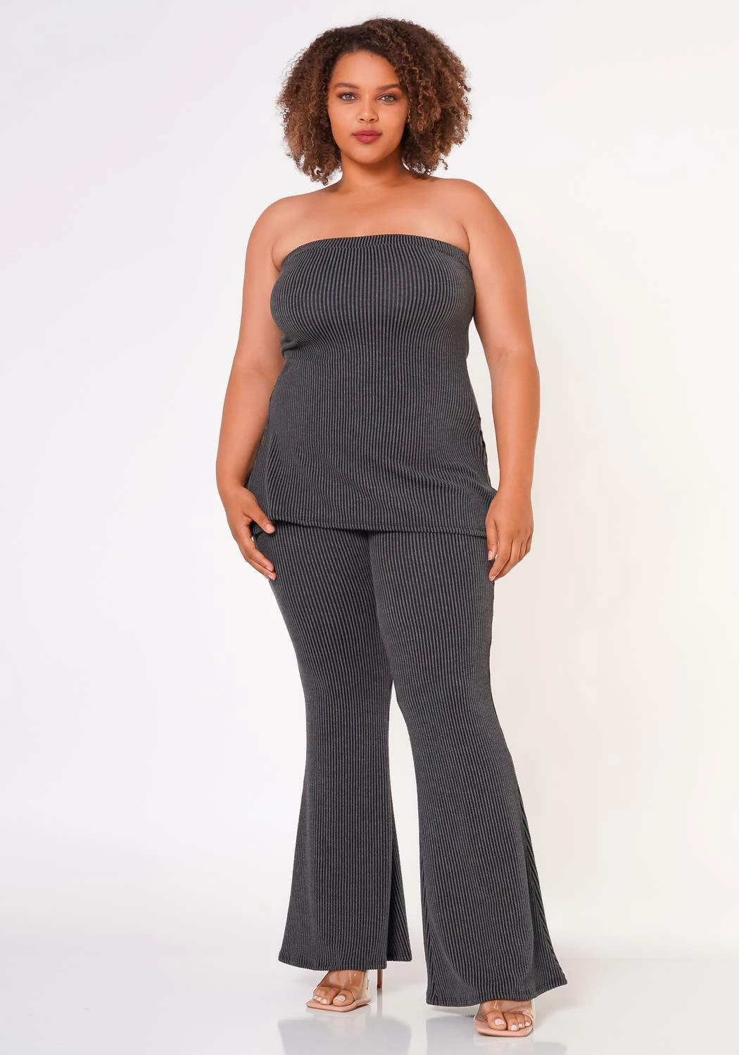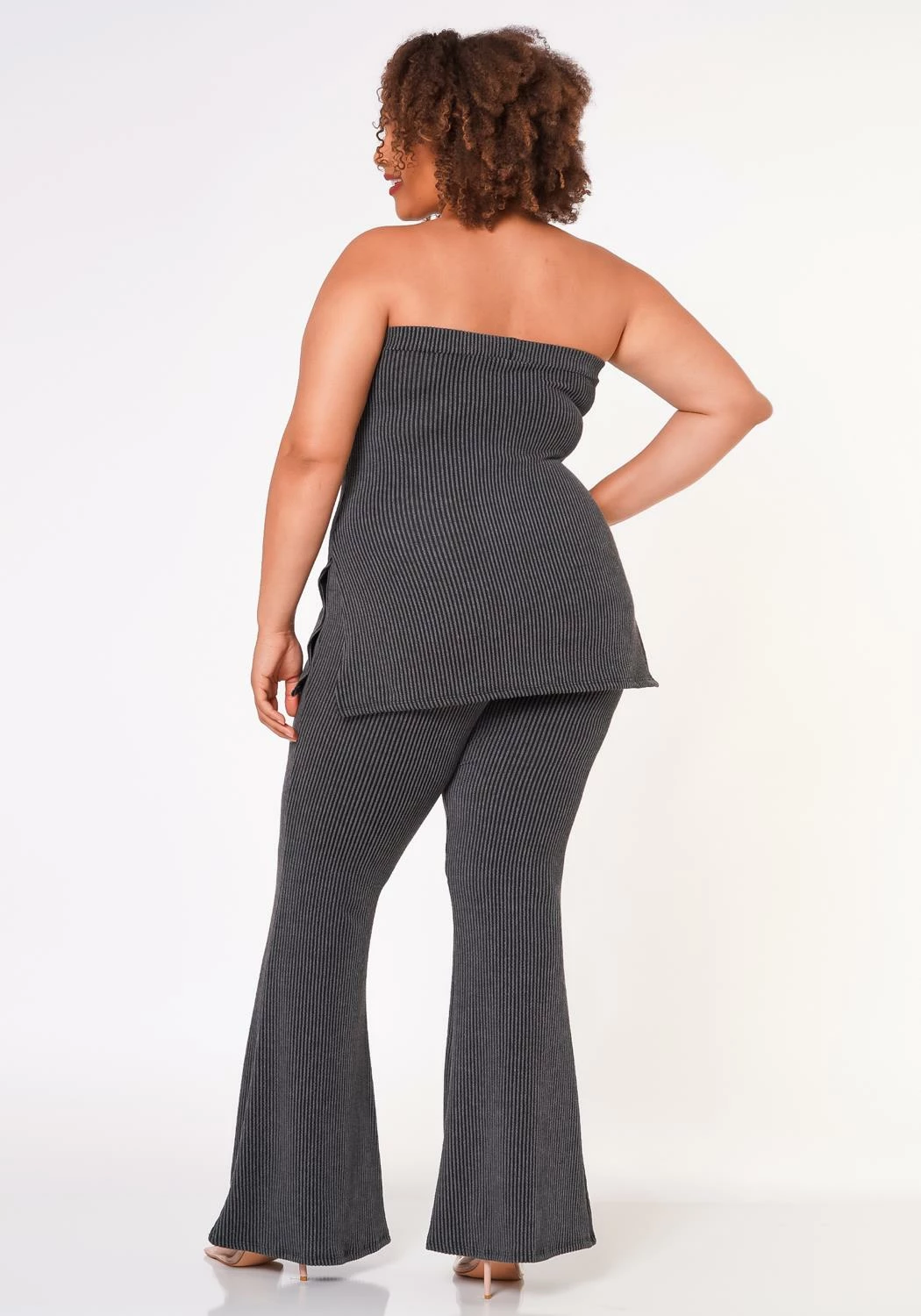 Plus size women’s matching two piece ribbed knit set which features a tube top with side split hem and high waist flare leggings.