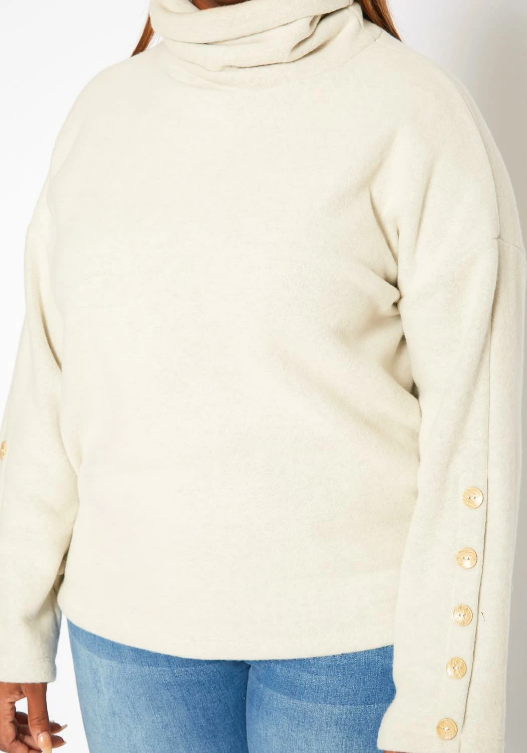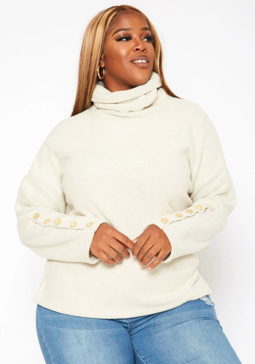 Cozy plus size women’s knit sweater in turtleneck style and long sleeves with button details.