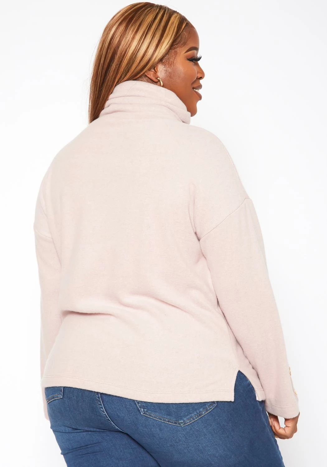 Cozy plus size women’s knit sweater in turtleneck style and long sleeves with button details.