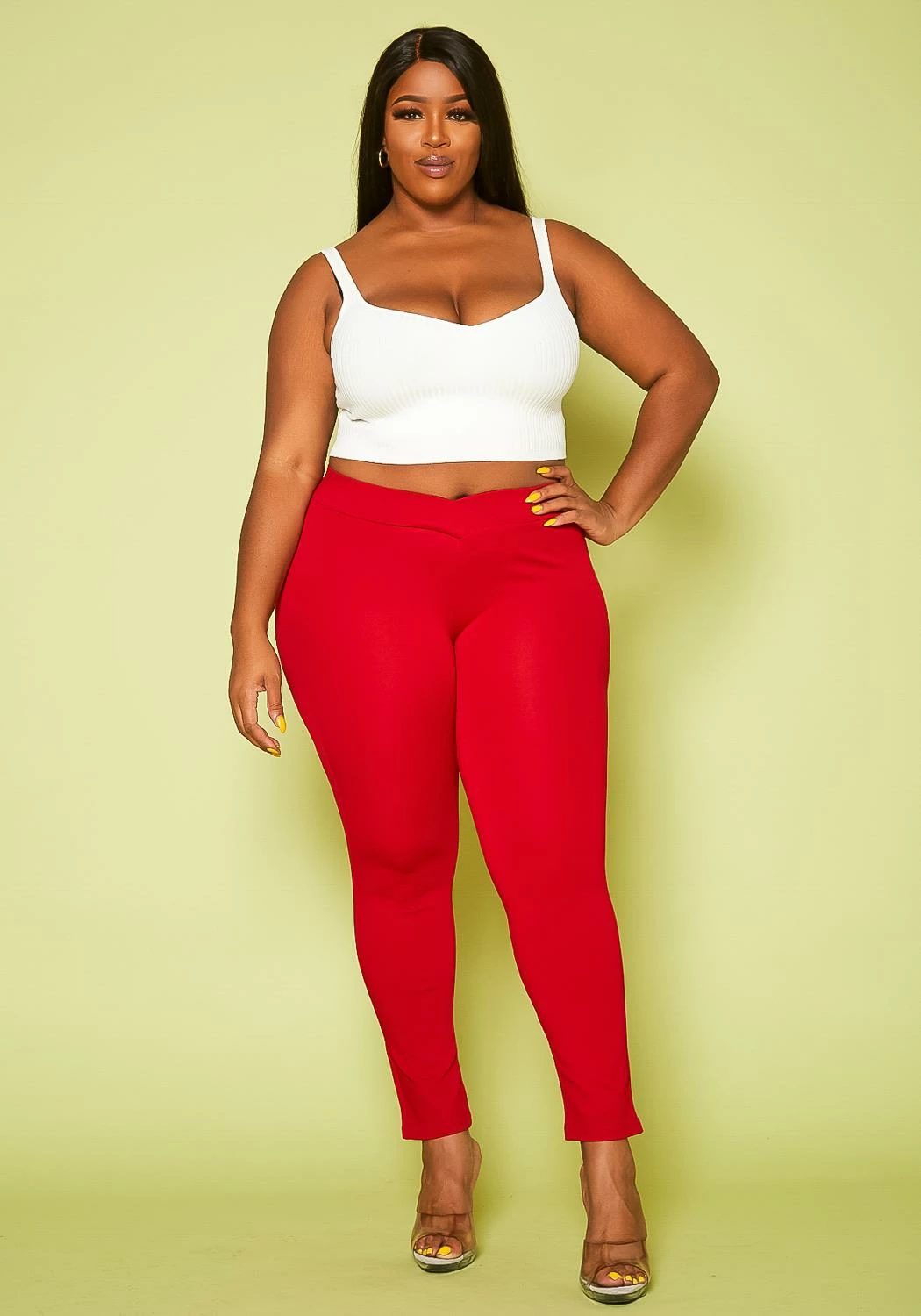Plus size women’s pants in tube style featuring a v front detail.