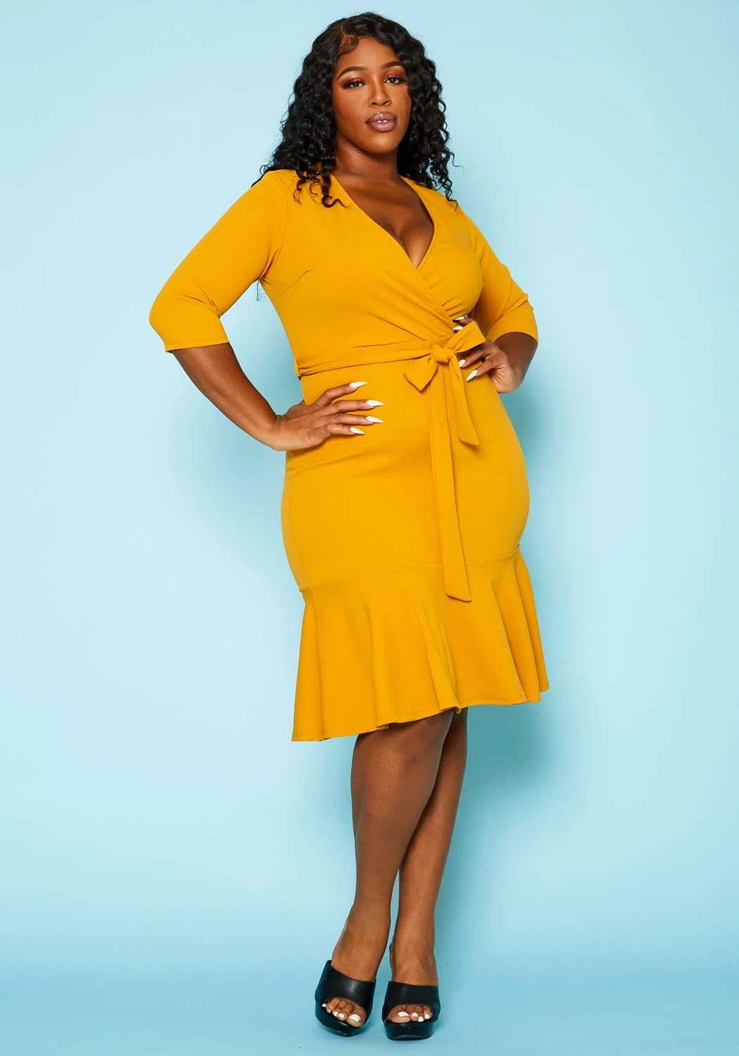 Lovely plus size women’s mini dress in v-neck style, short sleeves, waist tie ascent and flare hem.