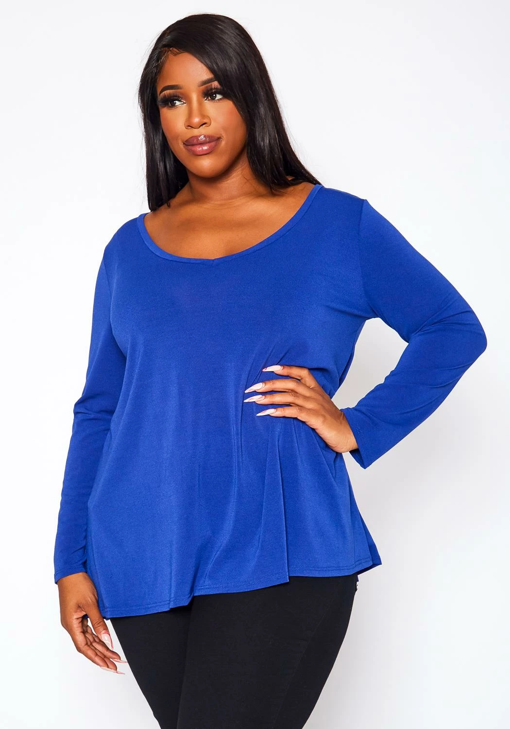 Casual plus size women’s top in v-neck style, fitted long sleeves and flare fitting.