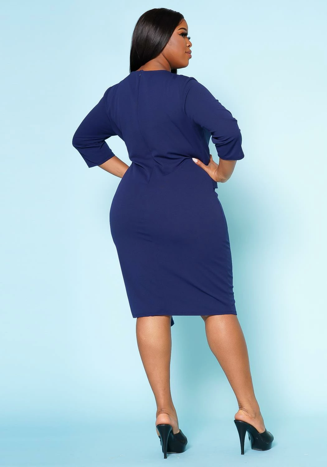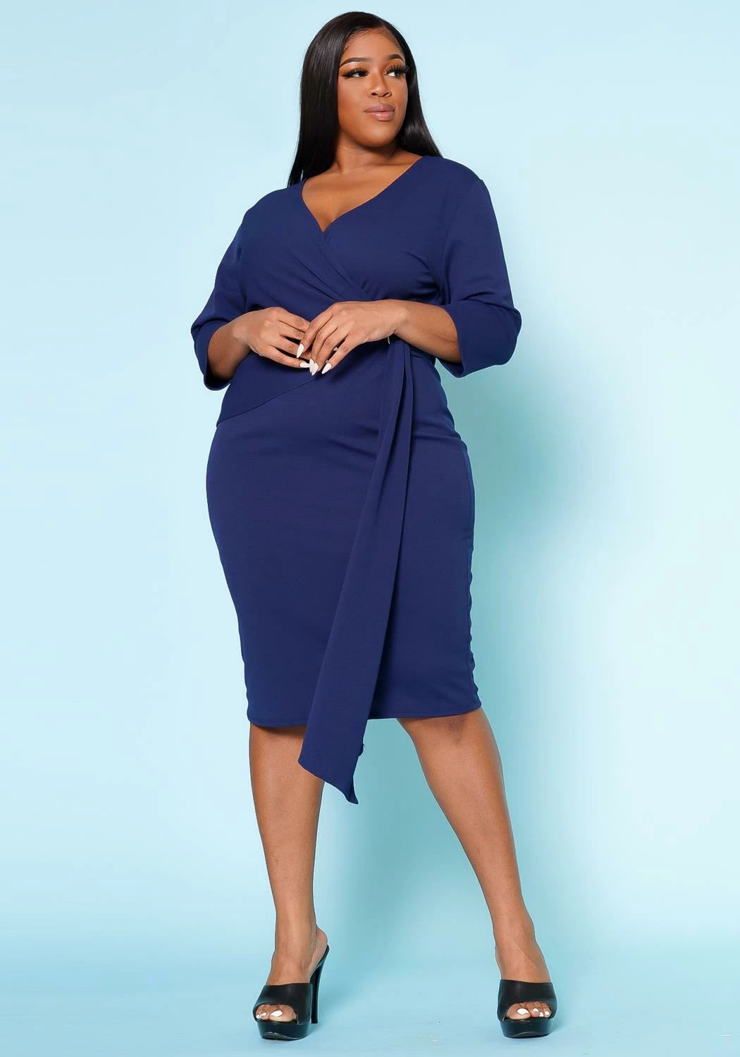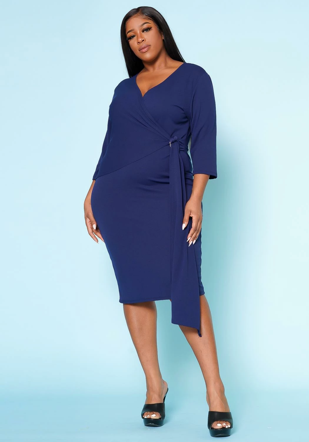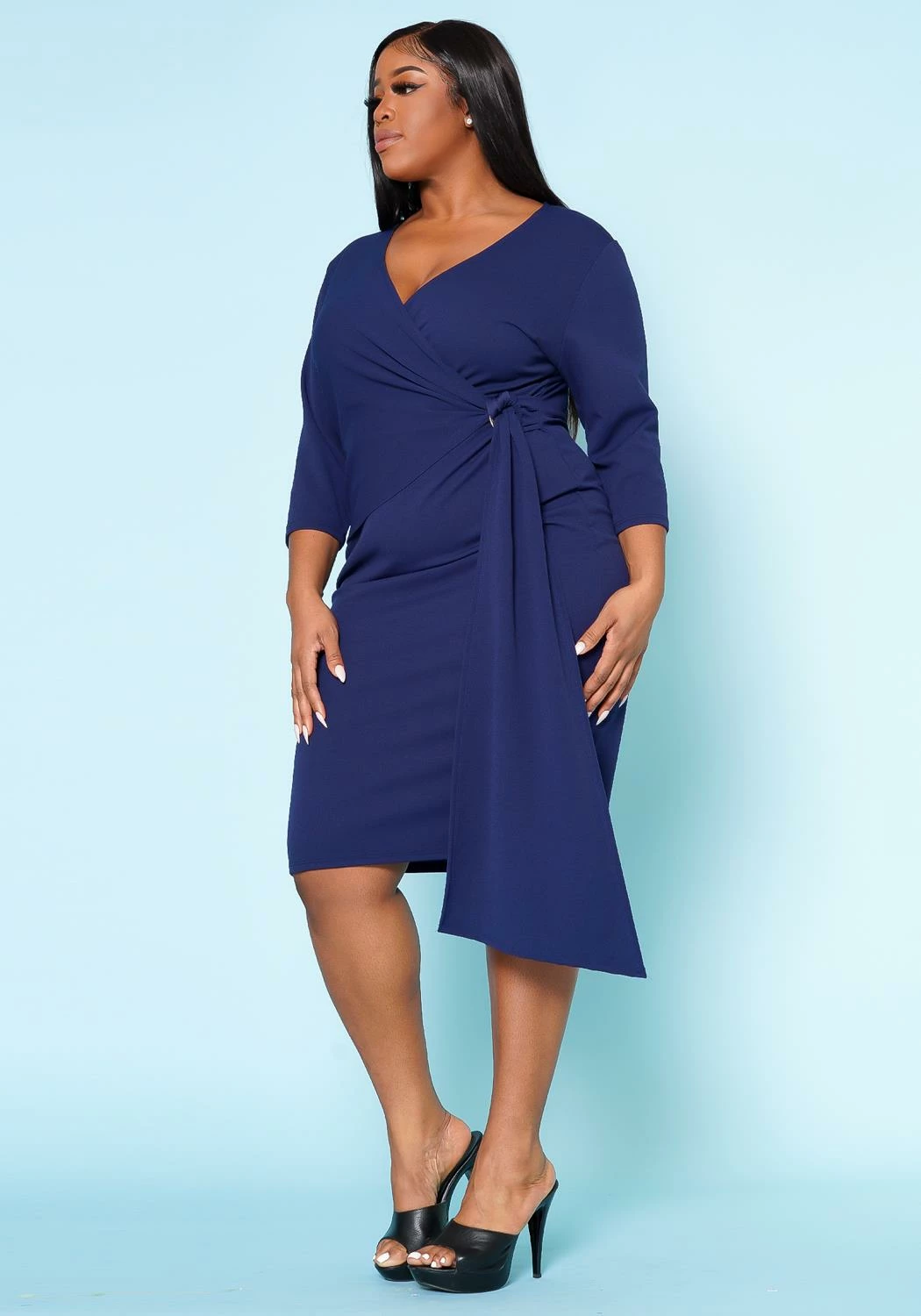 A stunning addition to any wardrobe. The dress boasts a flattering v-neck style that accentuates the neckline and 3/4 long sleeves that offer coverage and warmth while maintaining a chic look.