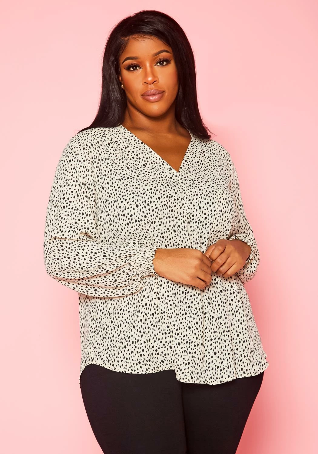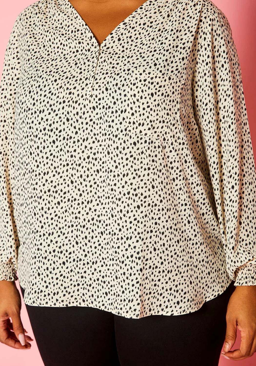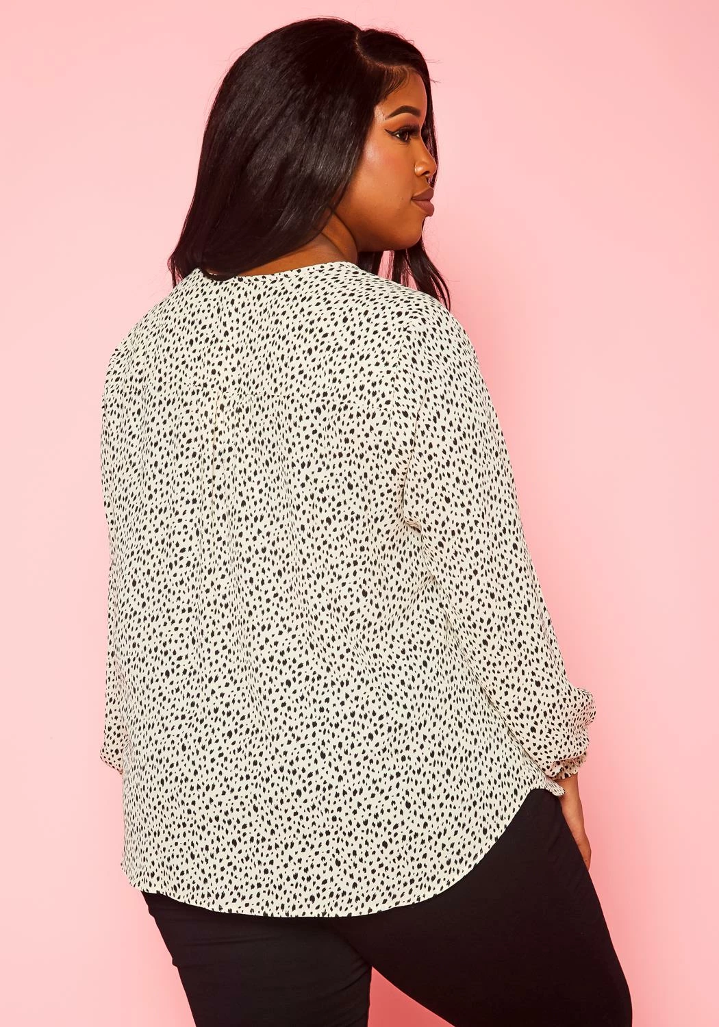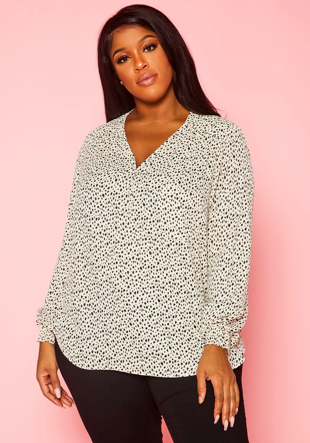 A chic appealing blouse in spotted print, v neck design, a casual loose fitting, full length long sleeves with smocked wrist cuffs and front button closure.