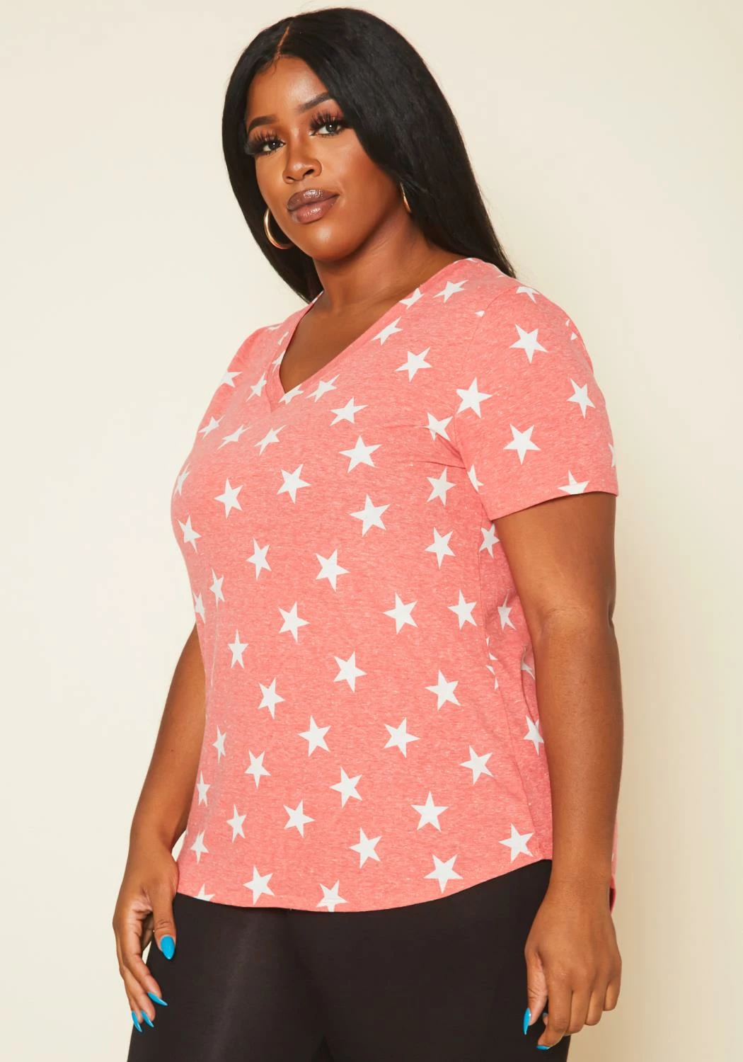 Plus size women’s basic top featuring short sleeves, v-neck style and star pattern.