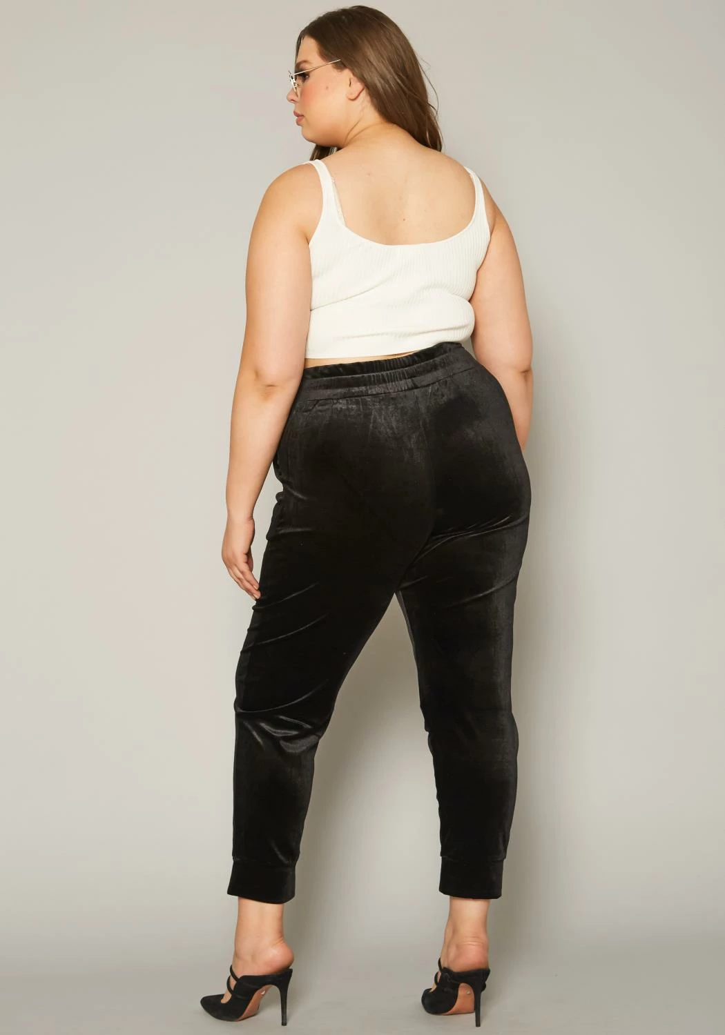 Gorgeous velour pants in high waist style, pocket hem, waistline drawstring hem and fitted ankle hem.