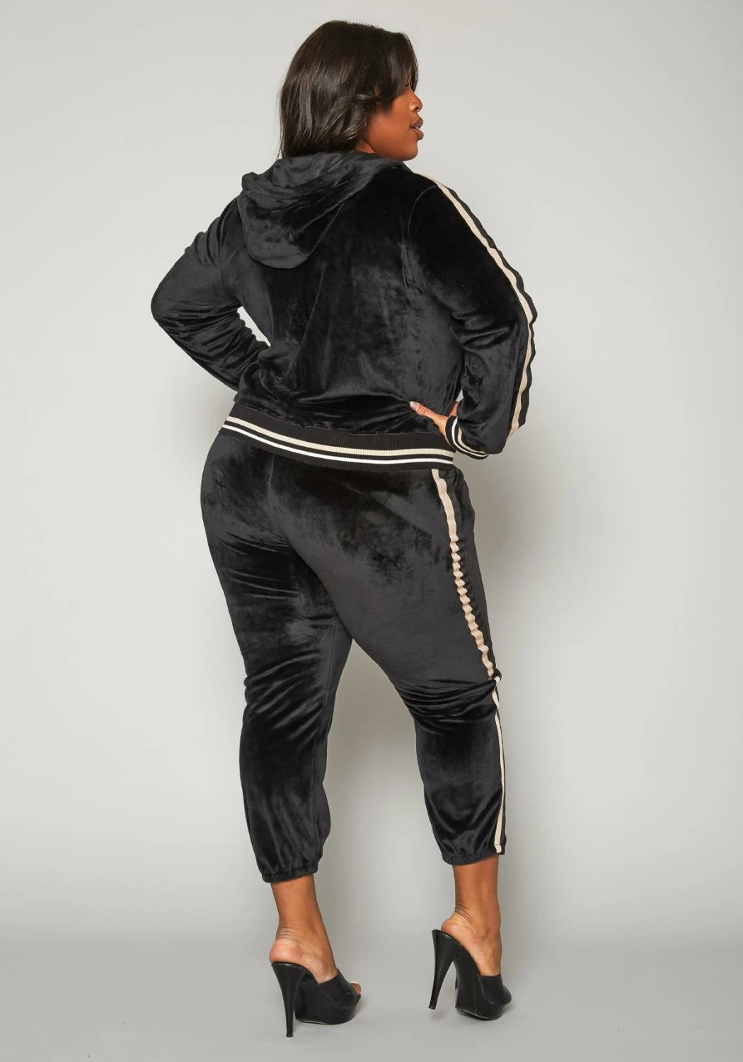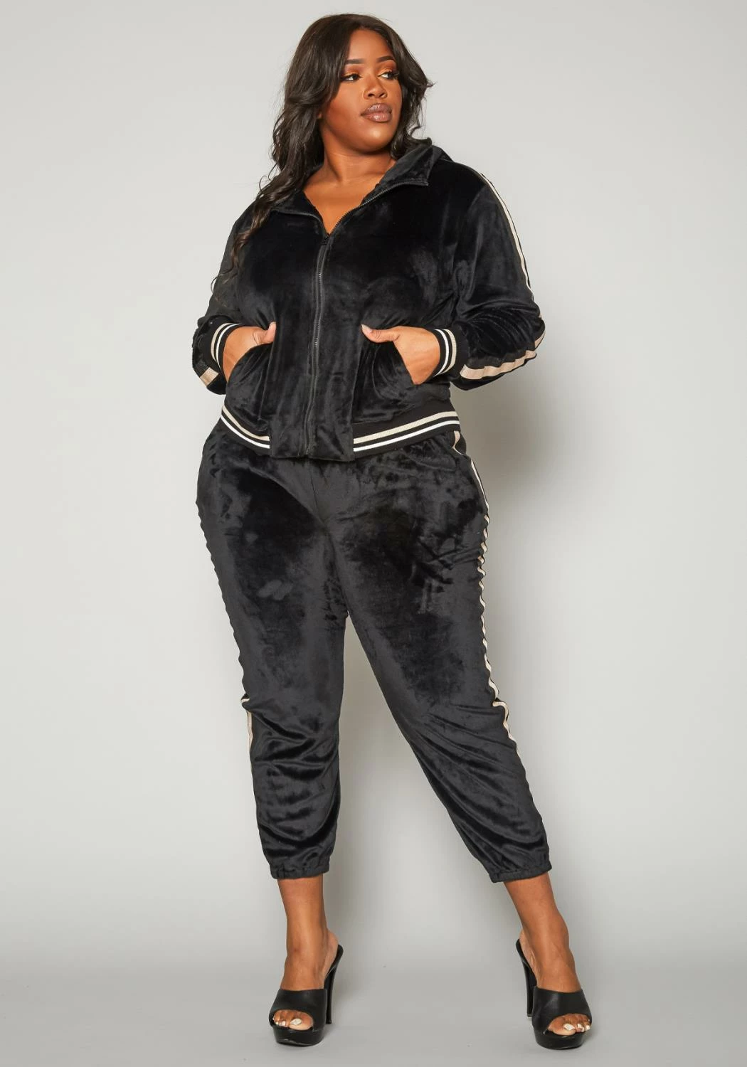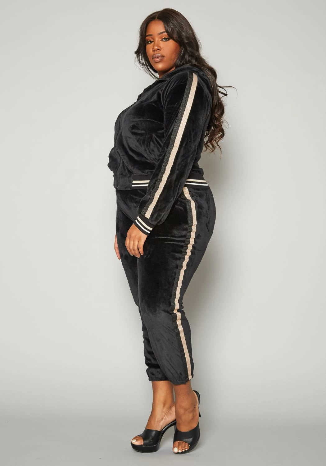 Trendy plus size women’s velvet tracksuit which features a zip front hooded sweater with golden varsity stripe and matching jogger pants.