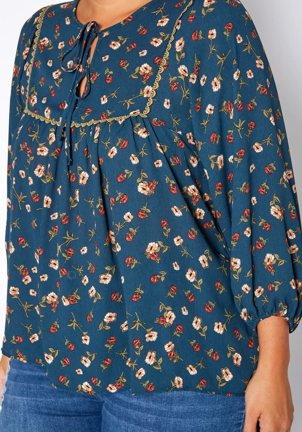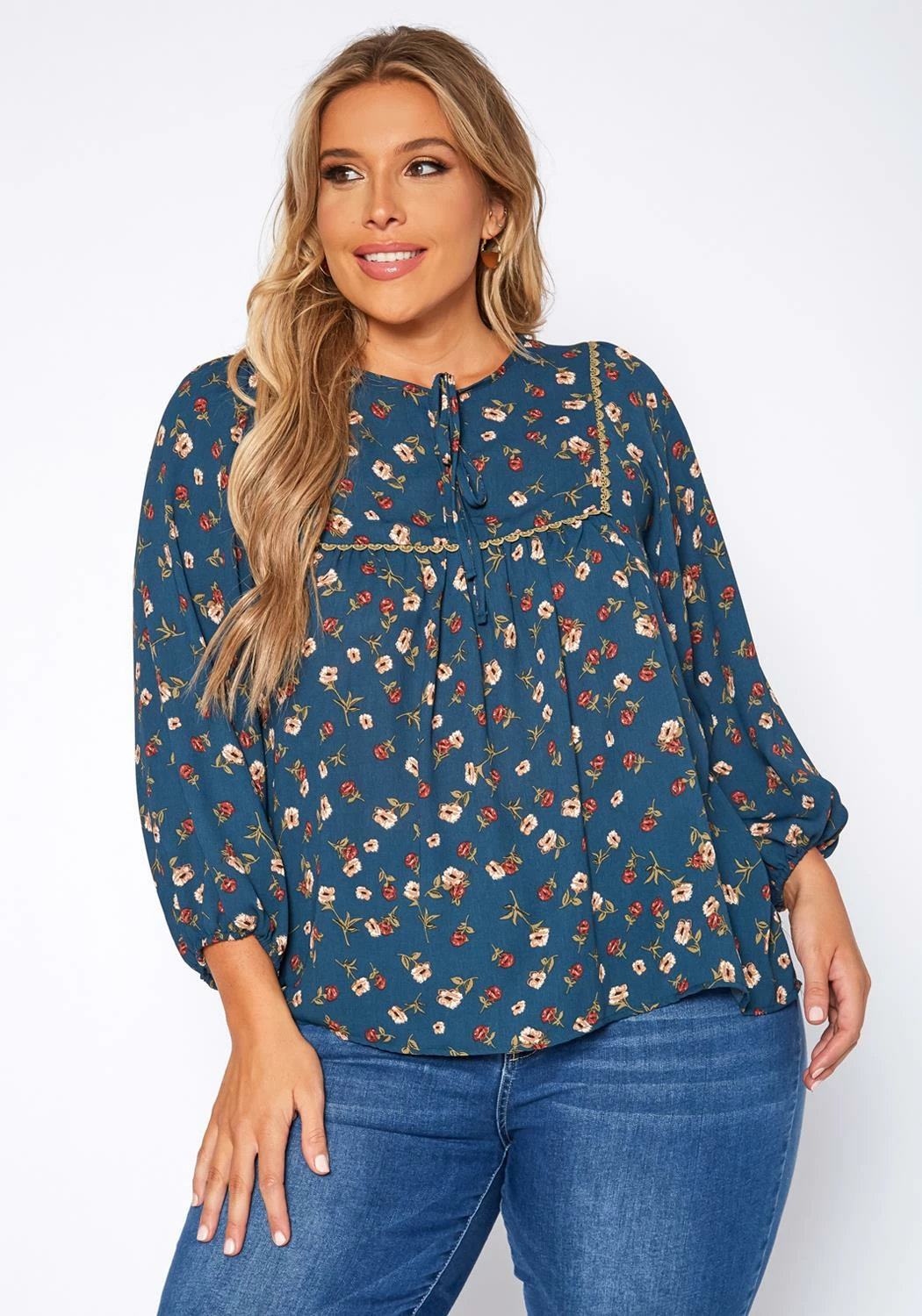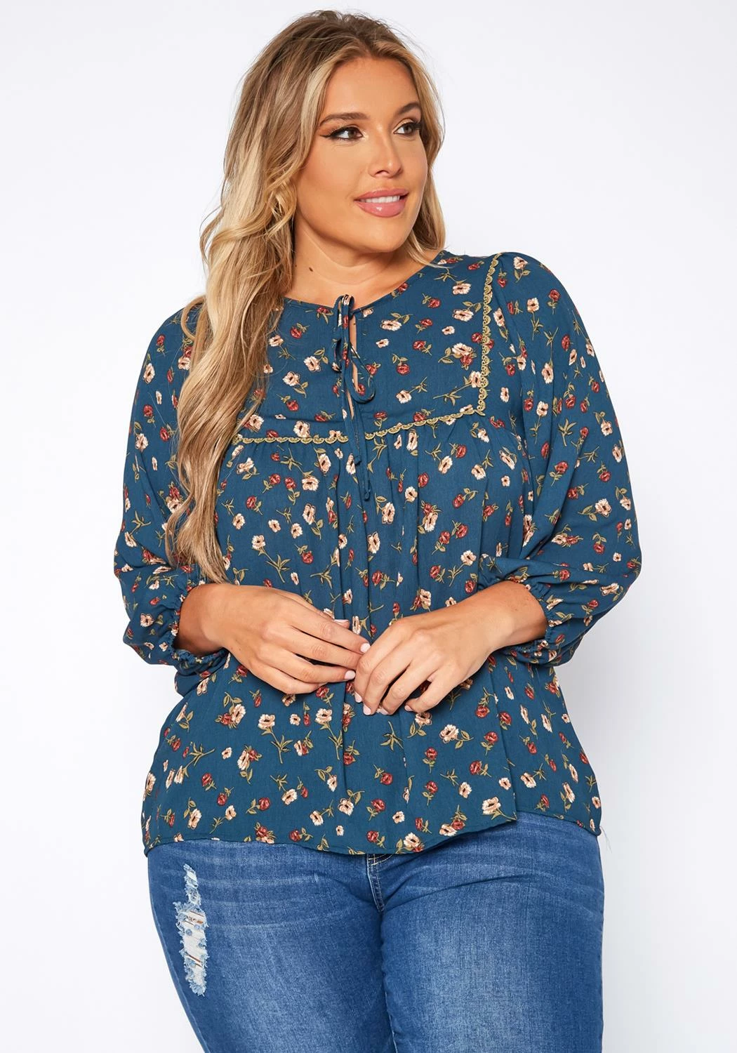 Lovely plus size women’s blouse in floral print, 3/4 long sleeves, elastic wrist cuffs, tie-front detail and flare design.