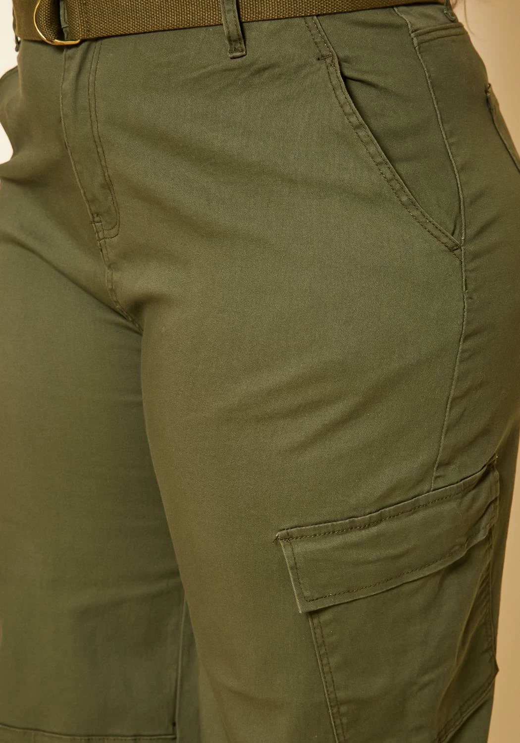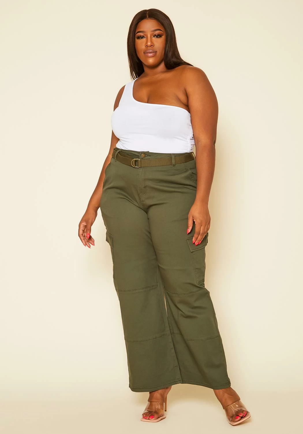 Plus size women’s pants in cargo style, featuring wide leg hem, side leg, back & hip pockets, button/zipper closure with a detachable o-ring belt.