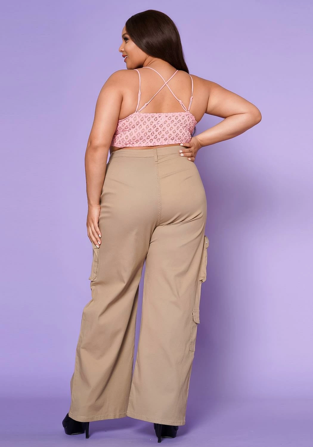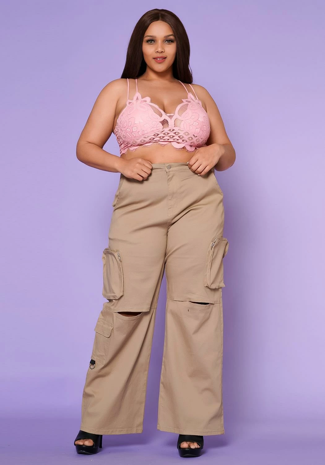 Trendy plus size women’s wide leg utility cargo pants featuring pocket hem, knee slit detail, belt loop holes and high rise fit.