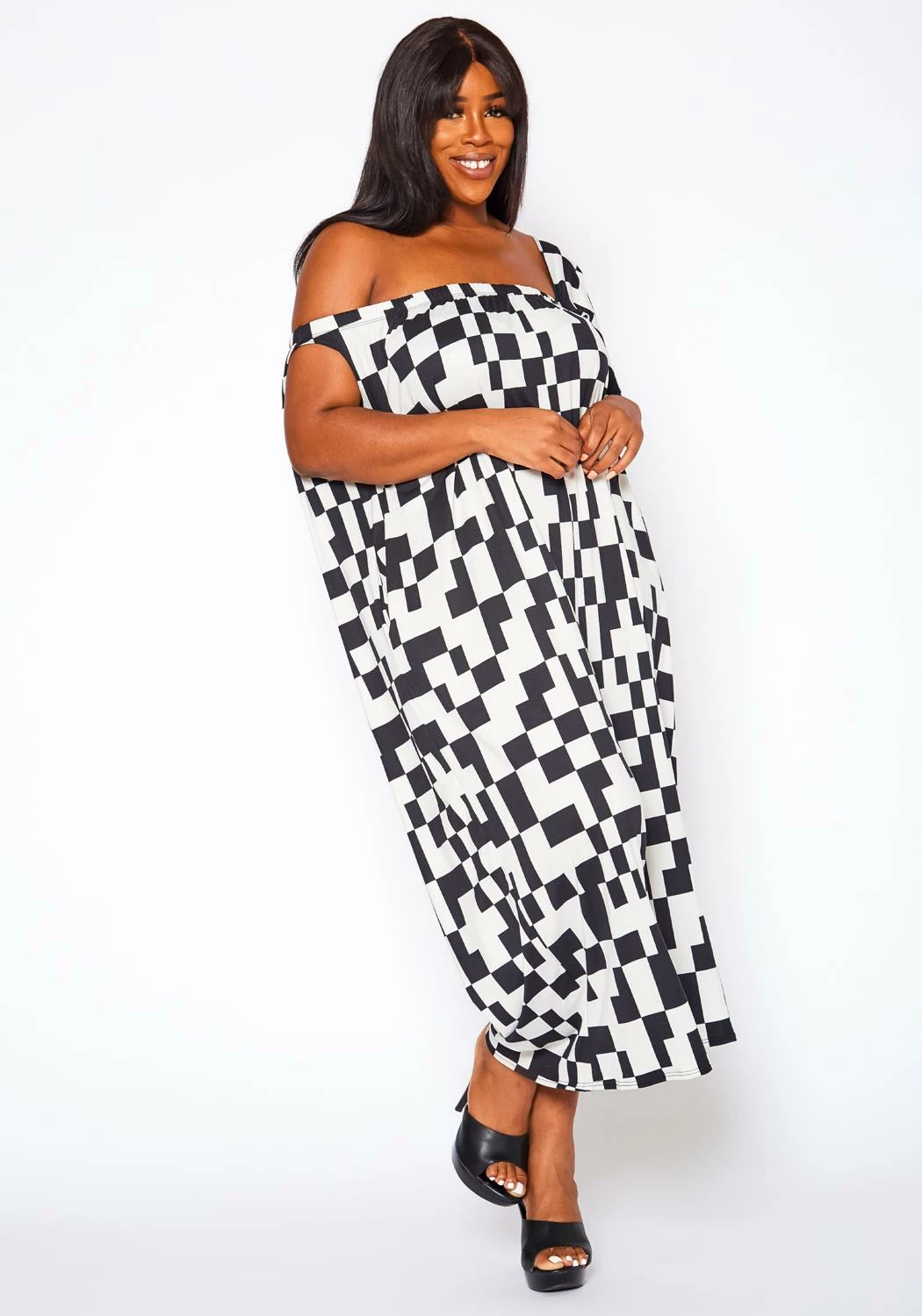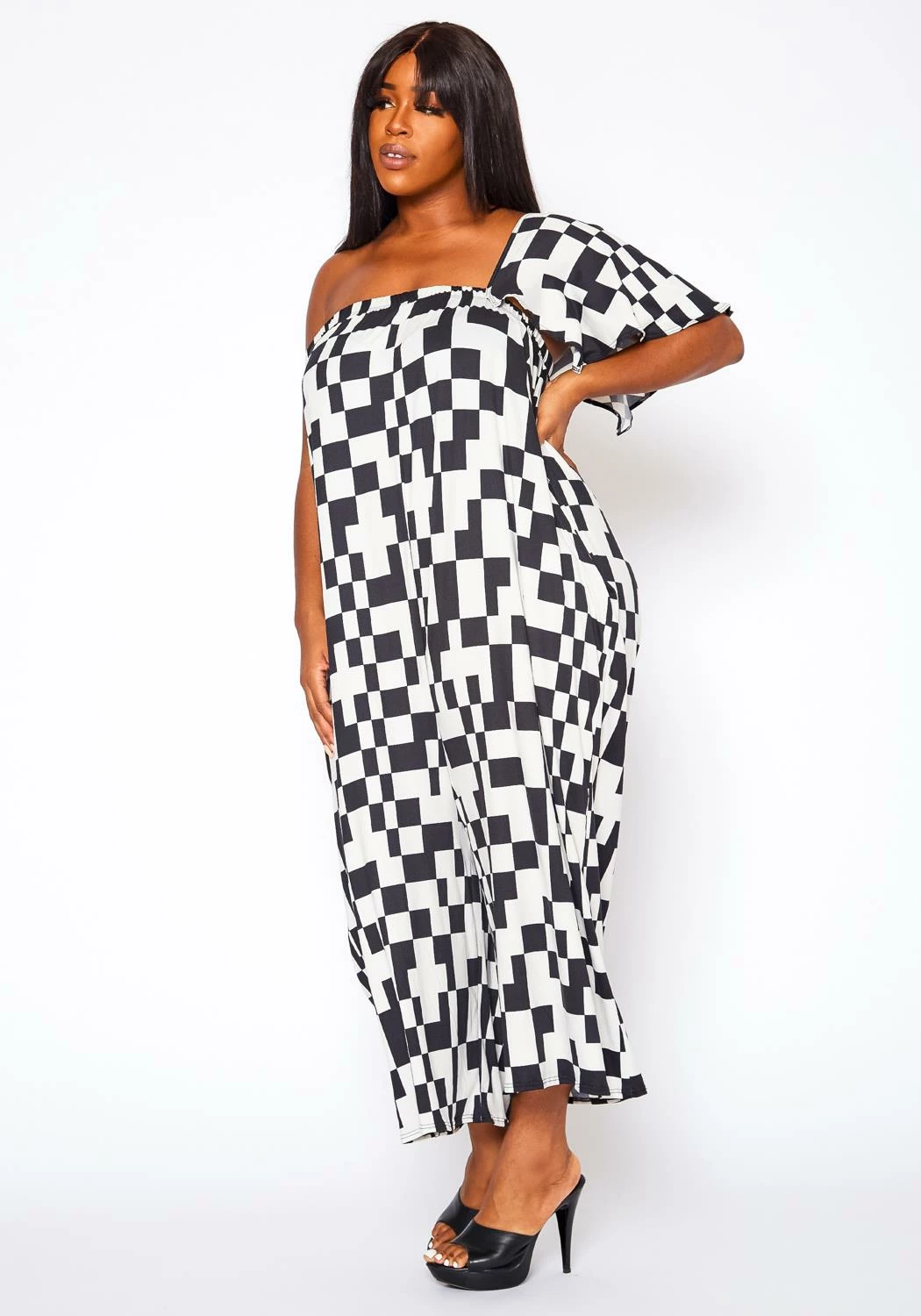 Comfortable plus size women’s jumpsuit, featuring asymmetrical one sleeve detail, wide leg hem, off shoulder & side pockets.