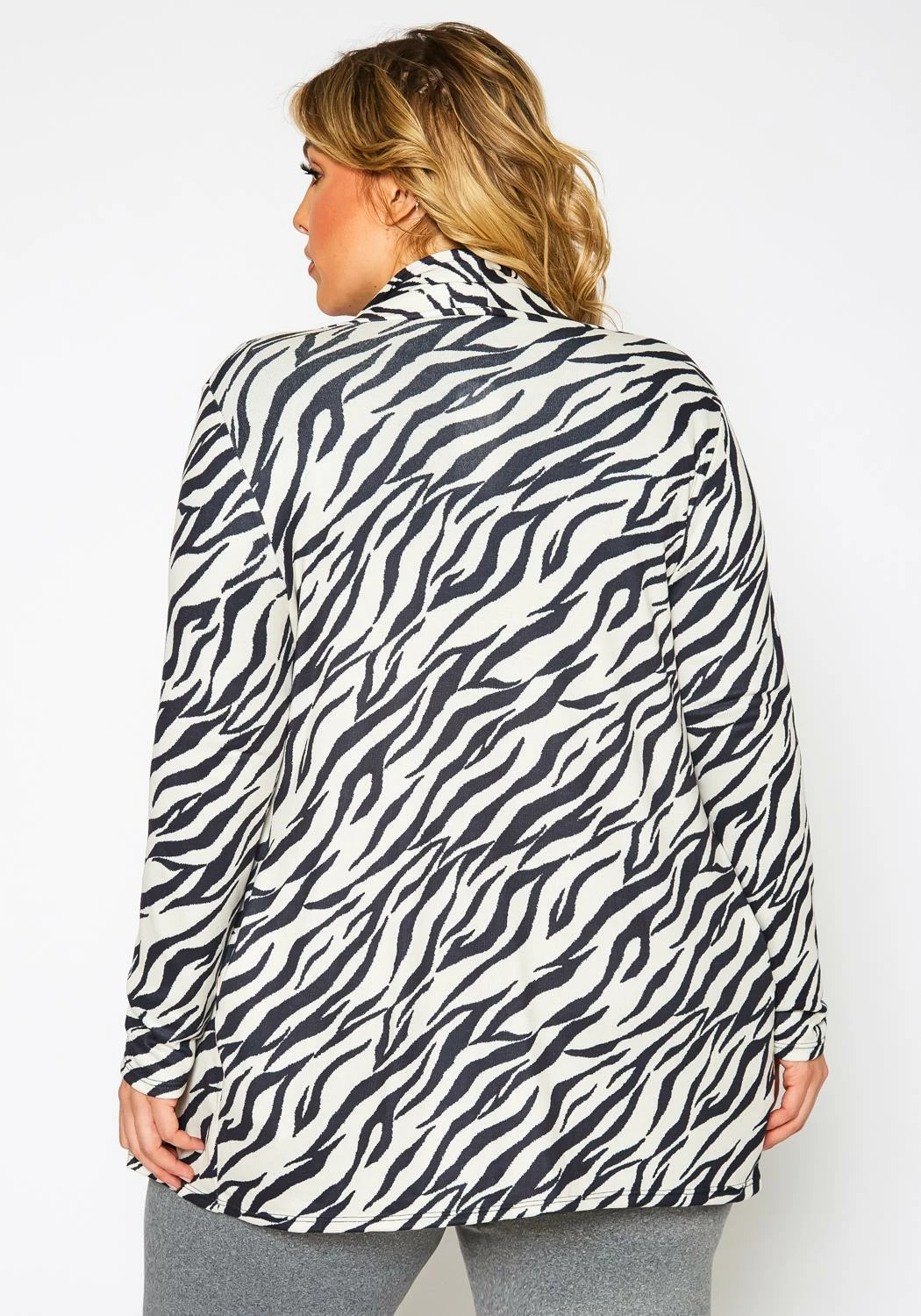 Casual plus size women’s soft knit cardigan in zebra pattern, fitted long sleeves and open front style.