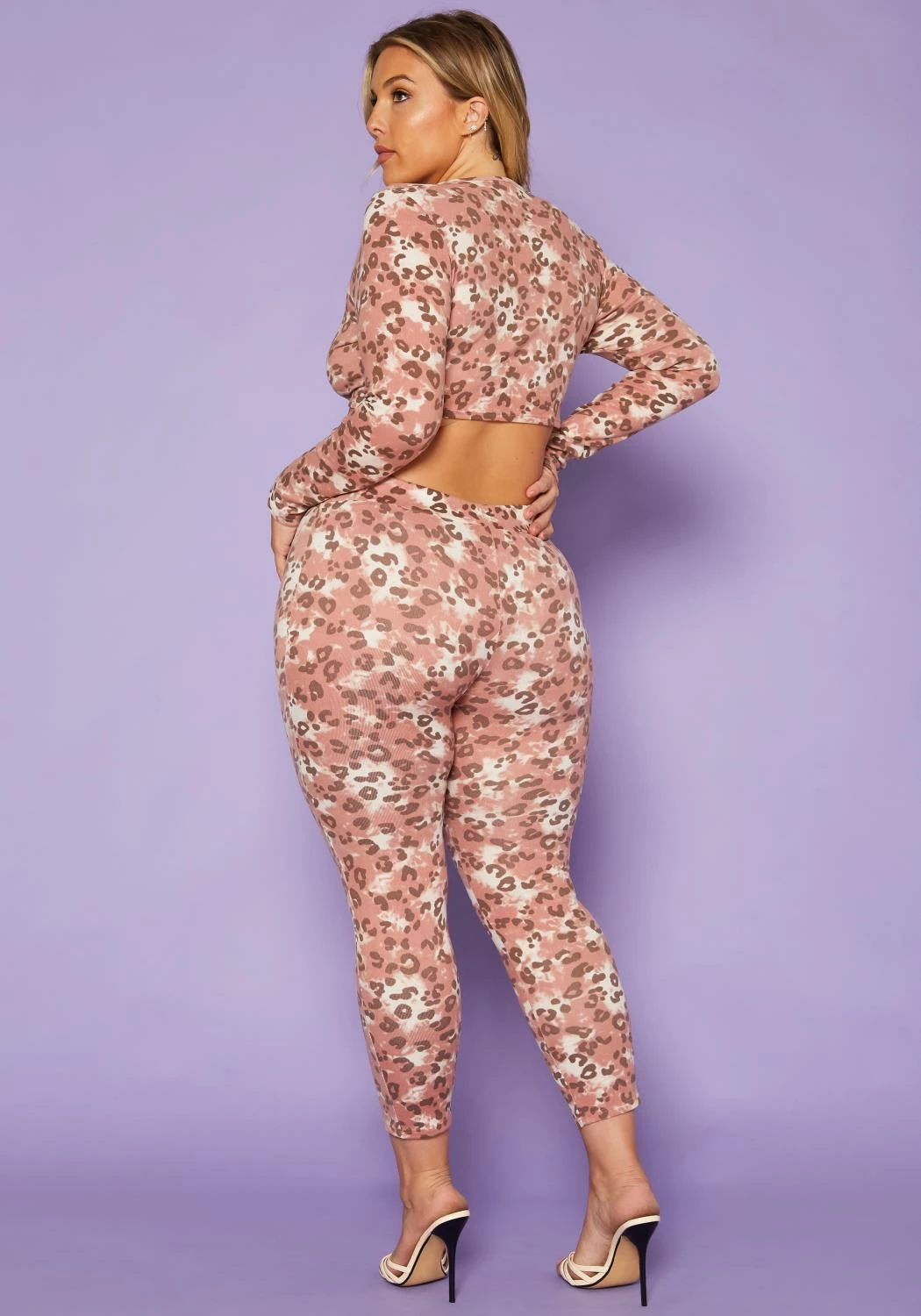 One of a kind plus size women’s two piece set in leopard print. Features a tie-front, v-neck style, long sleeve crop top and mid rise leggings.