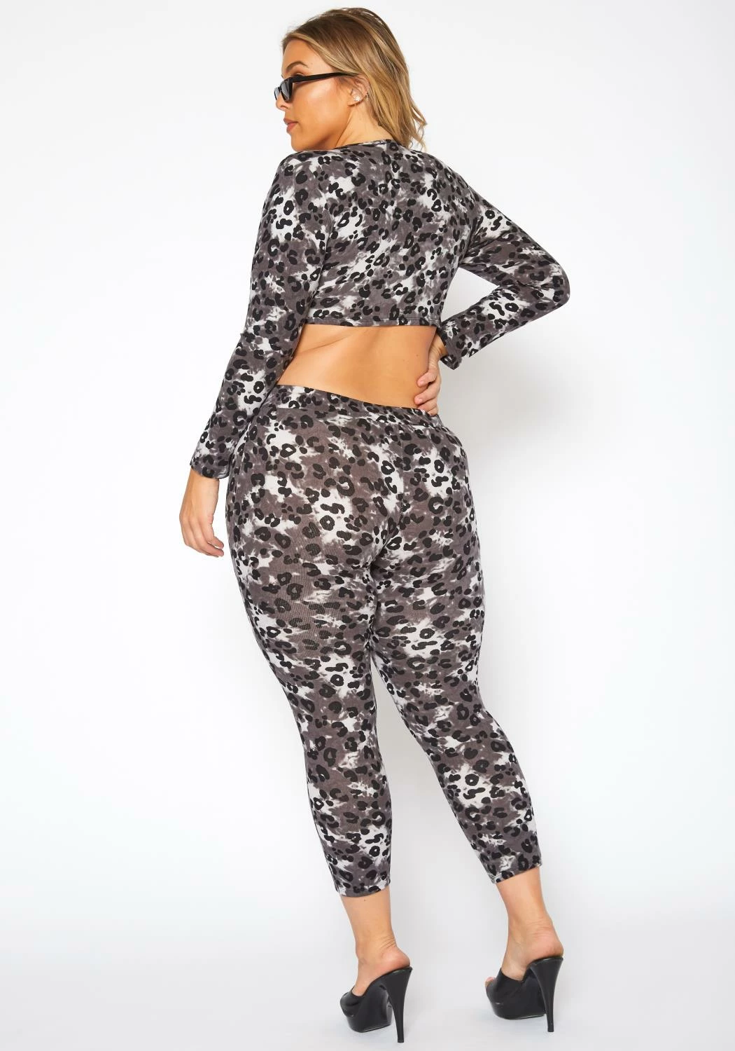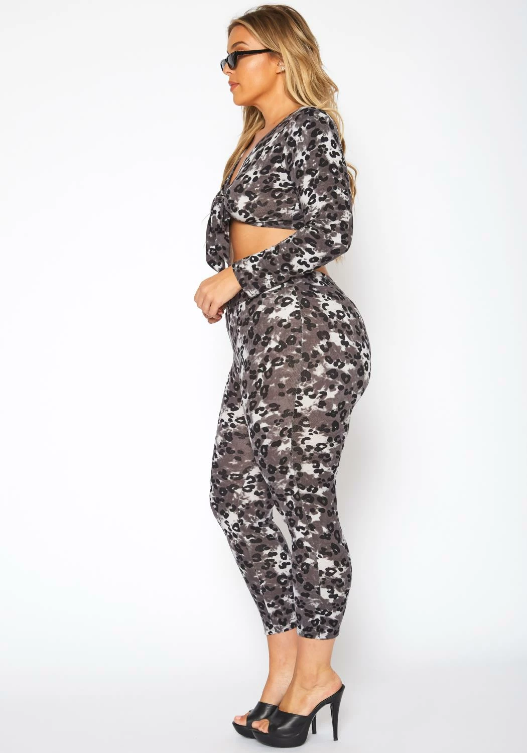 One of a kind plus size women’s two piece set in leopard print. Features a tie-front, v-neck style, long sleeve crop top and mid rise leggings.