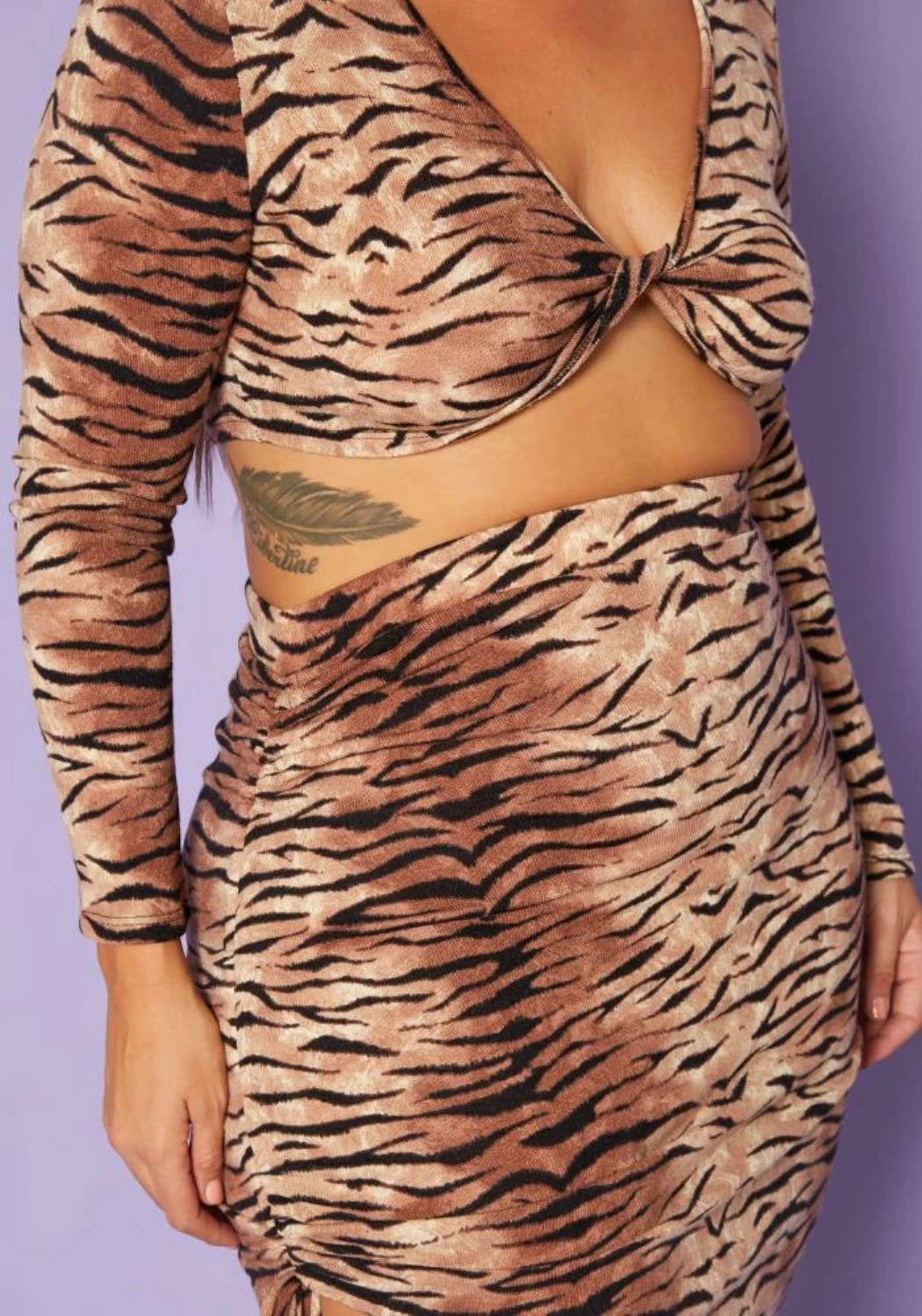 Stunning plus size women’s matching set in animal pattern, Features a twist hem, v-neck style, long sleeve crop top and high waist, drawstring hem, asymmetric midi skirt.