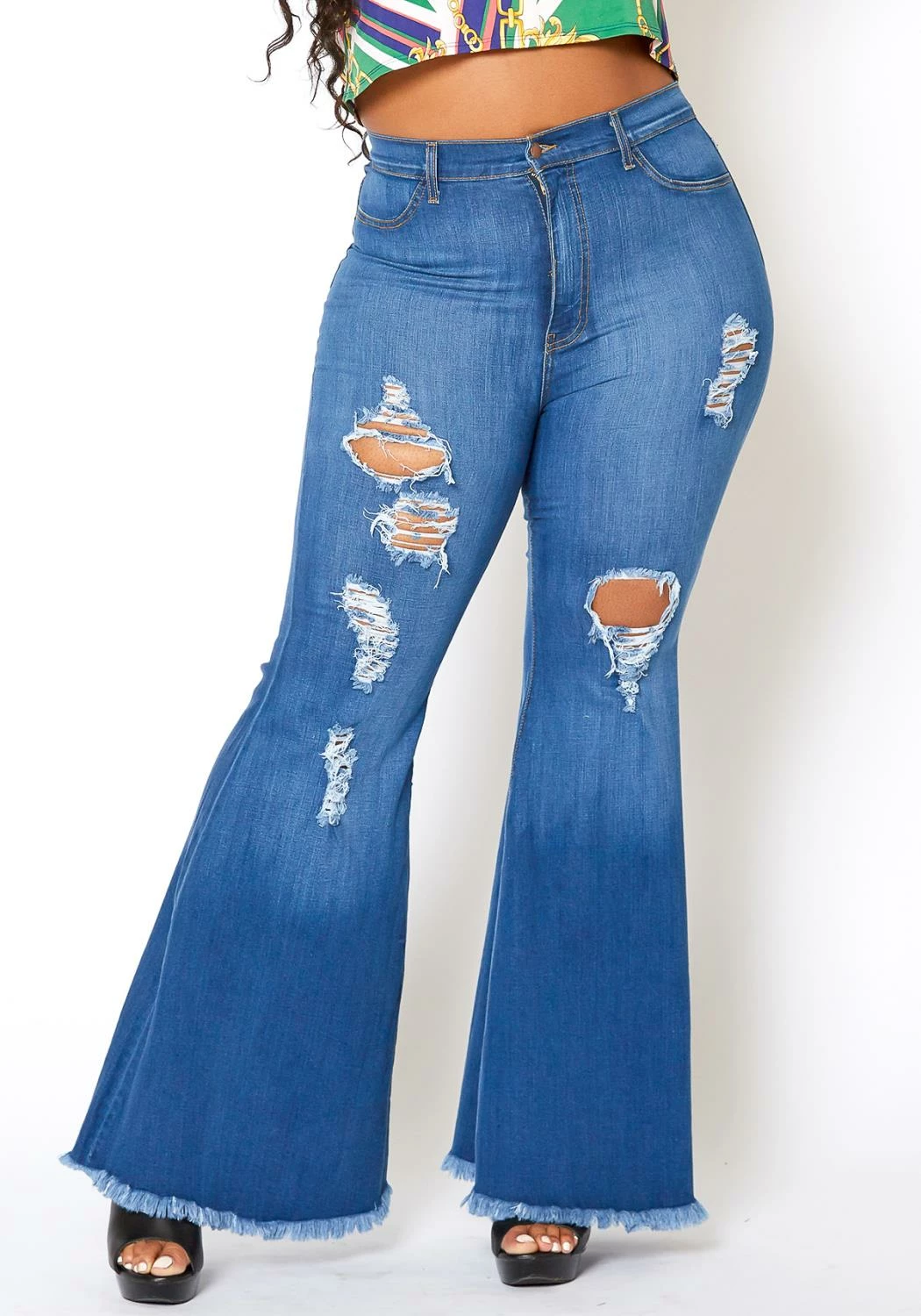 Asoph x Vibrant plus size denim high waisted jeans with bell bottom design, frayed hem detail, front distress hems, belt loop holes and pockets.