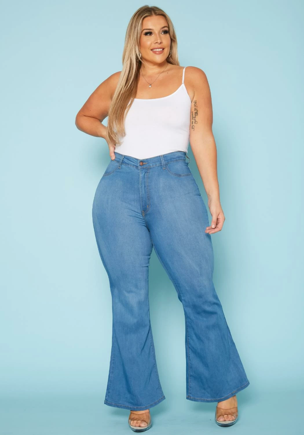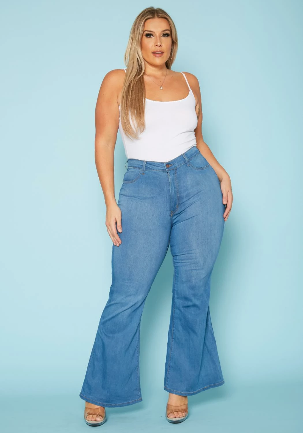 Asoph x Vibrant plus size women’s high waist bell bottom flared hem jean in comfy high waist fit plus includes pockets and belt loop holes..