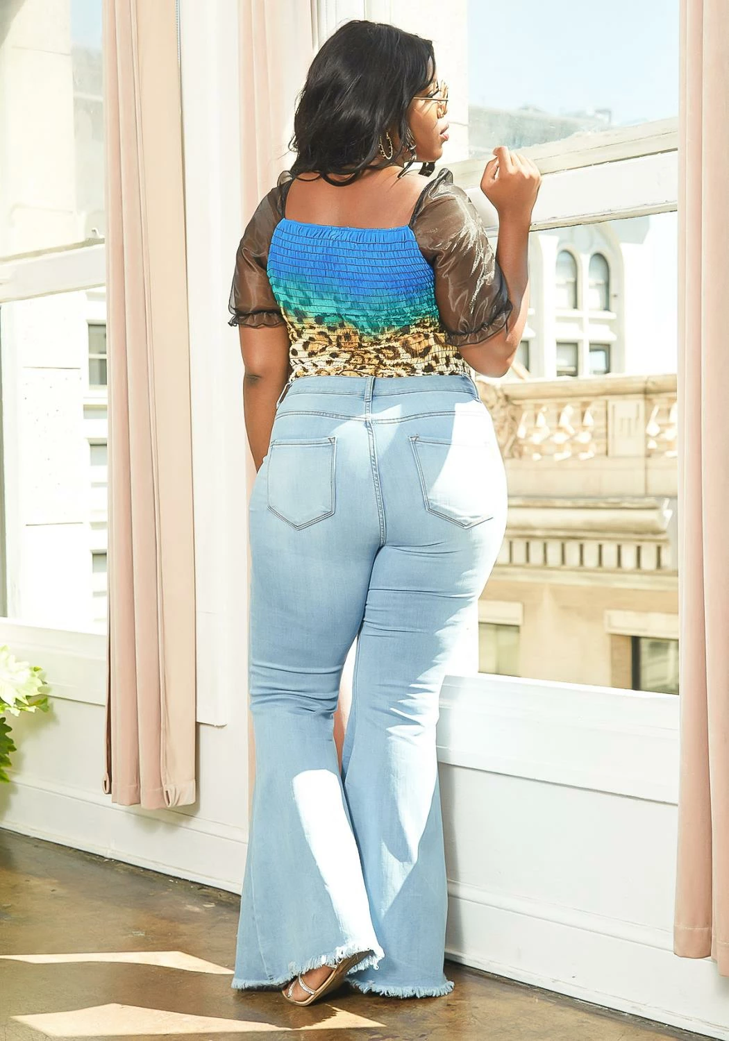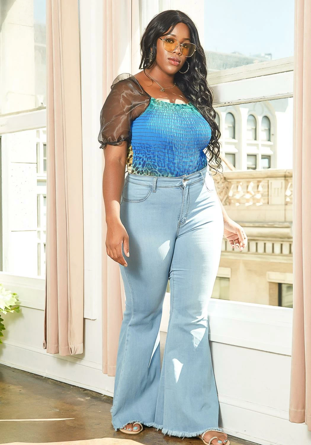 Asoph x Vibrant plus size women’s bold flared bell bottom high waist jean which features a raw cut end hem, belt loop holes and pockets.